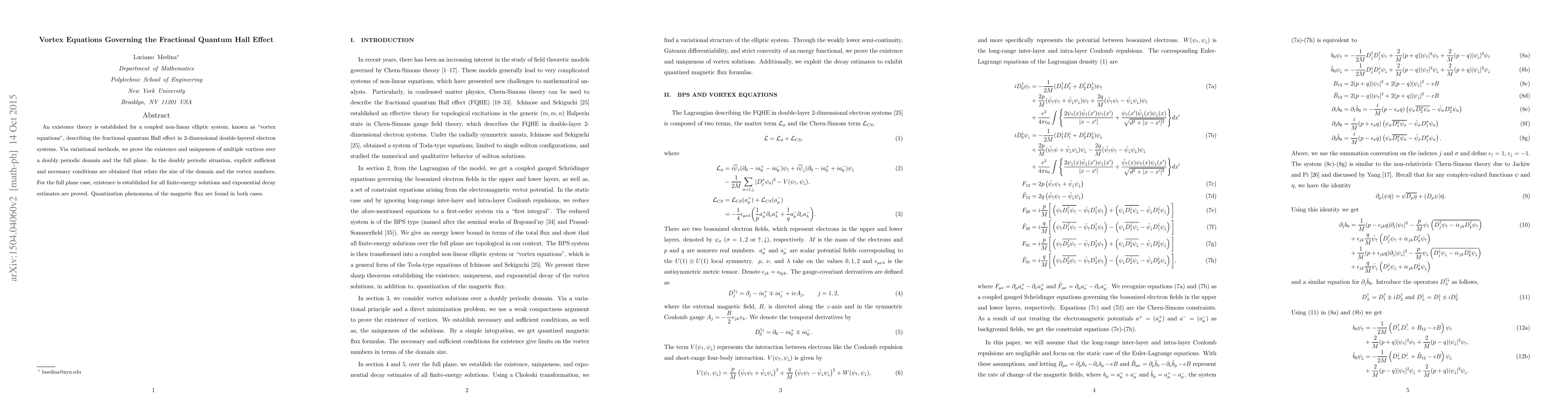 An existence theory is established for a coupled non-linear elliptic system, known as "vortex equations", describing the fractional quantum Hall effect in 2-dimensional double-layered electron systems. Via variational methods, we prove the existence and uniqueness of multiple vortices over a doubly periodic domain and the full plane. In the doubly periodic situation, explicit sufficient and necessary conditions are obtained that relate the size of the domain and the vortex numbers. For the full plane case, existence is established for all finite-energy solutions and exponential decay estimates are proved. Quantization phenomena of the magnetic flux are found in both cases.