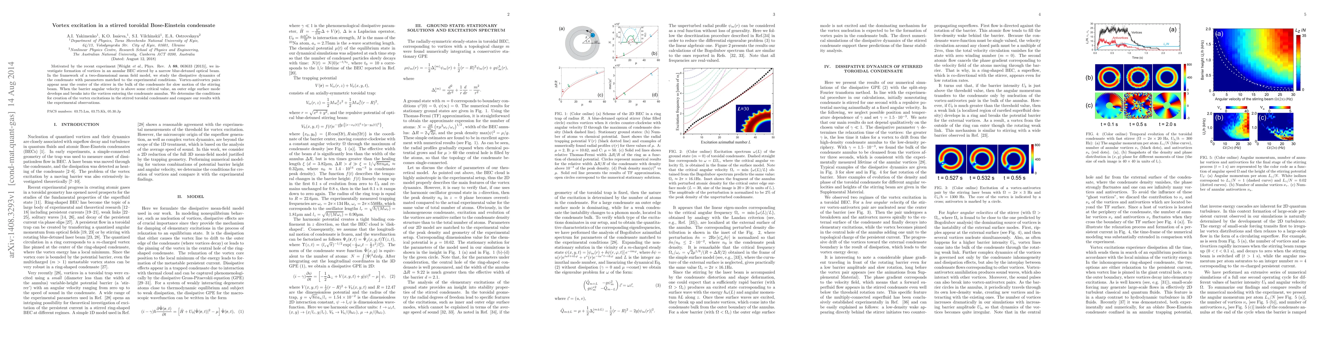 This paper investigates the formation of vortices in a toroidal Bose-Einstein condensate (BEC) under stirring by a blue-detuned optical beam, using a two-dimensional mean field model. It finds that vortex-antivortex pairs form near the center of the stirrer, and above a critical angular velocity, surface mode instabilities lead to vortex excitations entering the annulus.