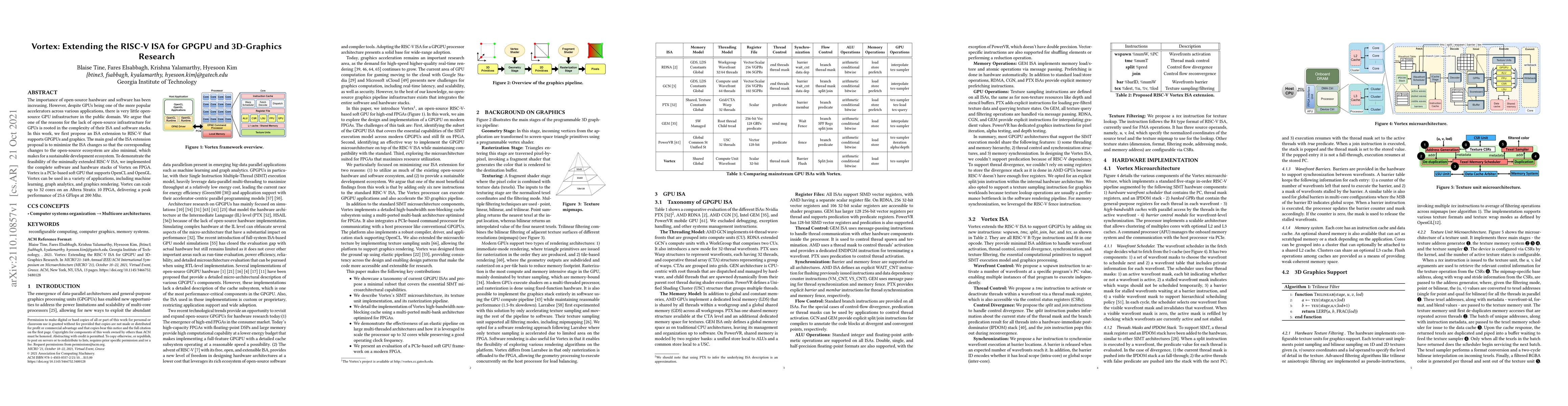 The importance of open-source hardware and software has been increasing. However, despite GPUs being one of the more popular accelerators across various applications, there is very little open-source GPU infrastructure in the public domain. We argue that one of the reasons for the lack of open-source infrastructure for GPUs is rooted in the complexity of their ISA and software stacks.In this work, we first propose an ISA extension to RISC-V that supports GPGPUs and graphics. The main goal of the ISA extension proposal is to minimize the ISA changes so that the corresponding changes to the open-source ecosystem are also minimal, which makes for a sustainable development ecosystem. To demonstrate the feasibility of the minimally extended RISC-V ISA, we implemented the complete software and hardware stacks of Vortex on FPGA. Vortex is a PCIe-based soft GPU that supports OpenCL and OpenGL.Vortex can be used in a variety of applications, including machine learning, graph analytics, and graphics rendering. Vortex can scale up to 32 cores on an Altera Stratix 10 FPGA, delivering a peak performance of 25.6 GFlops at 200 Mhz.