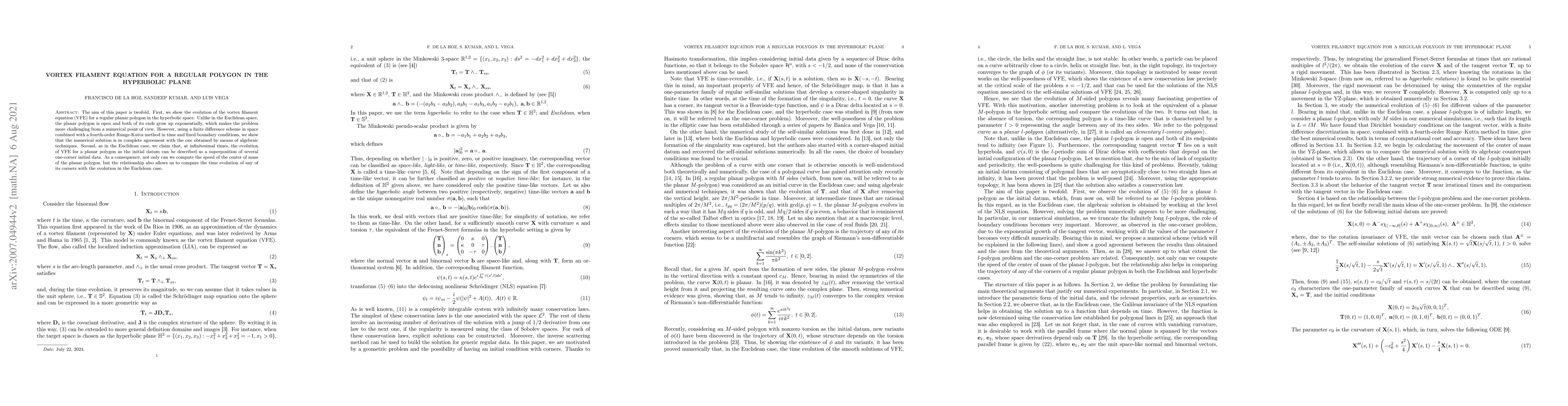 The aim of this article is twofold. First, we show the evolution of the vortex filament equation (VFE) for a regular planar polygon in the hyperbolic space. Unlike in the Euclidean space, the planar polygon is open and both of its ends grow exponentially, which makes the problem more challenging from a numerical point of view. However, with fixed boundary conditions, a finite difference scheme and a fourth-order Runge--Kutta method in time, we show that the numerical solution is in complete agreement with the one obtained from algebraic techniques. Second, as in the Euclidean case, we claim that, at infinitesimal times, the evolution of VFE for a planar polygon as the initial datum can be described as a superposition of several one-corner initial data. As a consequence, not only can we compute the speed of the center of mass of the planar polygon, but the relationship also allows us to compare the time evolution of any of its corners with that in the Euclidean case.