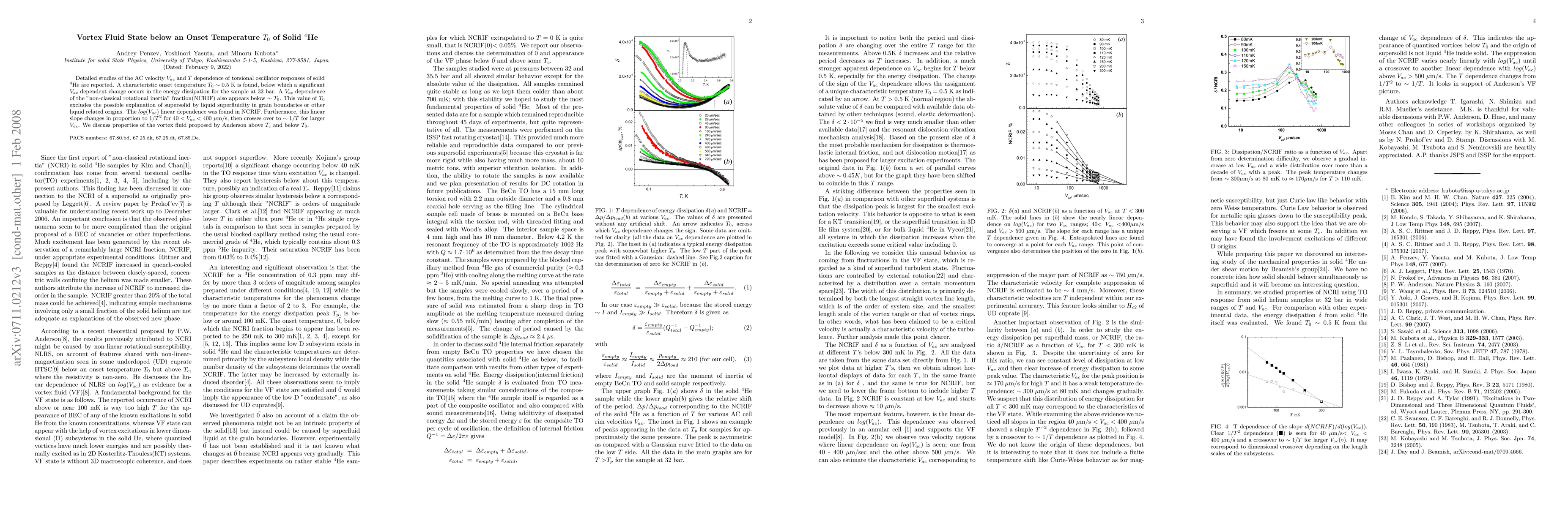 Detailed studies of AC velocity Vac and temperature dependence of torsional oscillator responses of solid 4He are reported. A characteristic onset temperature T0 about 0.5 K is found, below which a significant Vac dependent change occurs in the energy dissipation for the sample at 32 bar. A Vac dependence of the non-classical rotational inertia fraction, NCRIF also appears below about T0. This value of T0 excludes the possible explanation of supersolid by liquid superfluidity in grain boundaries or other liquid related origins. The log(Vac) linear dependence was found in NCRIF. Furthermore, this linear slope changes in proportion to 1/T 2 for 40 < Vac < 400 micro-m/s, then crosses over to about 1/T for larger Vac. We discuss properties of the vortex fluid state proposed by Anderson above Tc, below T0.