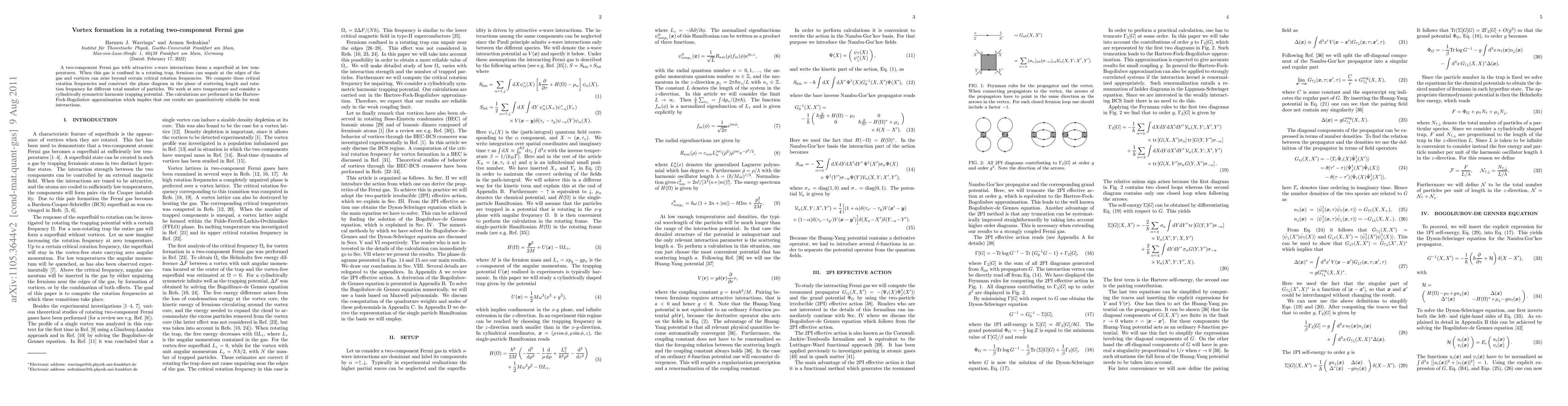 This paper investigates vortex formation in a rotating two-component Fermi gas with attractive s-wave interactions, determining critical rotation frequencies and constructing a phase diagram for various particle numbers. The study employs the Hartree-Fock-Bogoliubov approximation to achieve reliable results for weak interactions at zero temperature.