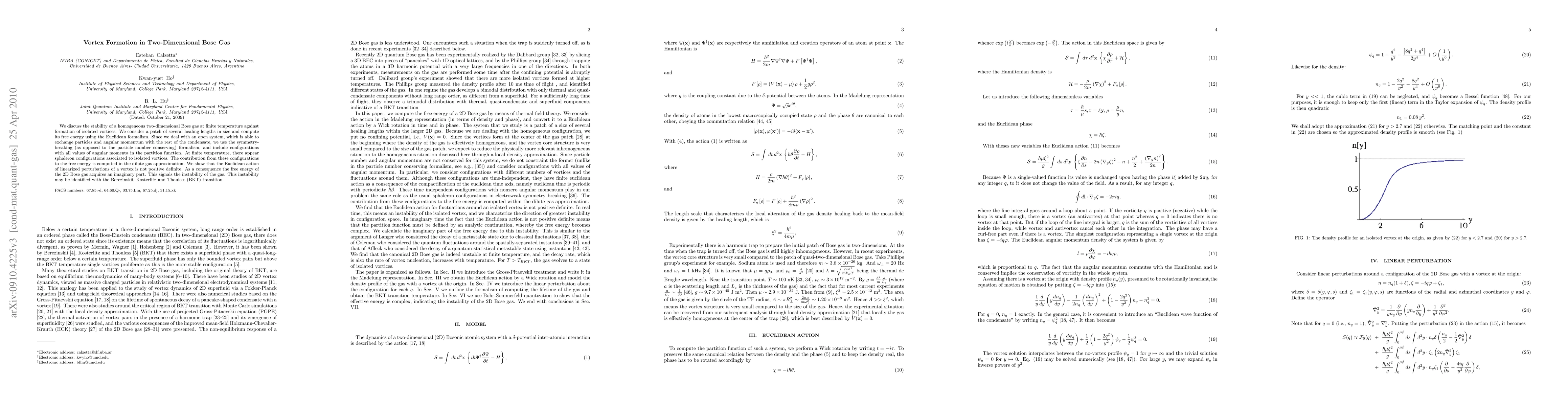 This research explores the stability of a 2D Bose gas at finite temperature, revealing that it's unstable against isolated vortex formation due to an imaginary part in the free energy. This instability aligns with the Berezinskii, Kosterlitz, and Thouless (BKT) transition.