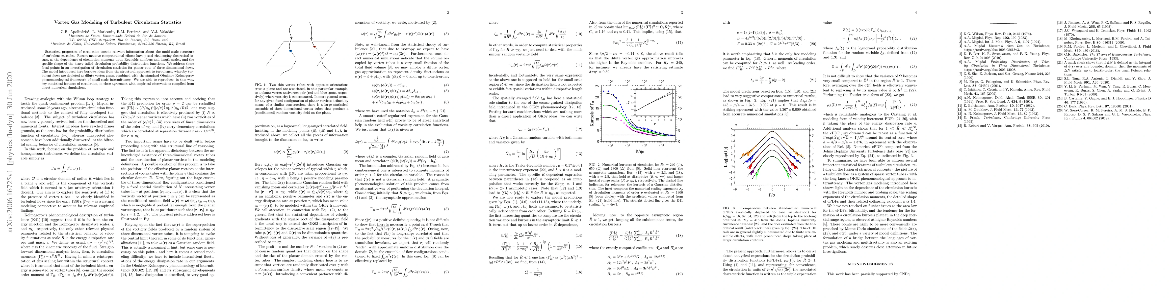 This paper develops a vortex gas model to analyze the statistical properties of circulation in turbulent flows, combining structural turbulence theory with the Obukhov-Kolmogorov framework to accurately reproduce key circulation statistics observed in direct numerical simulations.
