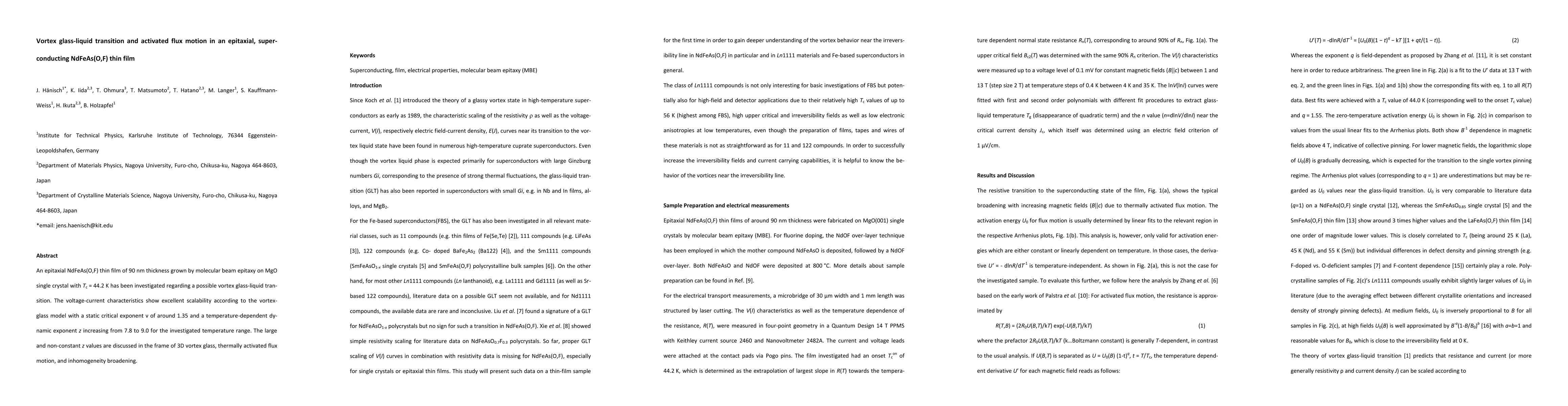 This paper investigates a 90 nm thick epitaxial NdFeAs(O,F) thin film superconductor, finding evidence for a vortex glass-liquid transition with a static critical exponent of 1.35. The dynamic exponent z varies significantly with temperature, suggesting thermally activated flux motion and inhomogeneity effects.