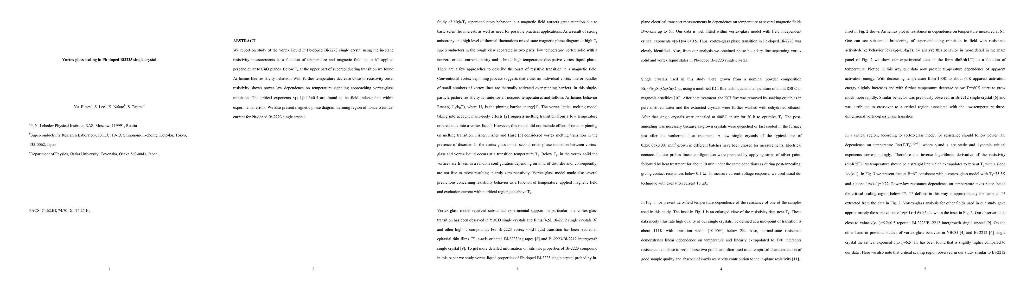 We report on study of the vortex liquid in Pb-doped Bi-2223 single crystal using the in-plane resistivity measurements as a function of temperature and magnetic field up to 6T applied perpendicular to CuO planes. Below Tc at the upper part of superconducting transition we found Arrhenius-like resistivity behavior. With further temperature decrease close to resistivity onset resistivity shows power law dependence on temperature signaling approaching vortex-glass transition. The critical exponents nu(z-1)=4.6 plus-minus 0.5 are found to be field independent within experimental errors. We also present magnetic phase diagram defining region of nonzero critical current for Pb-doped Bi-2223 single crystal.