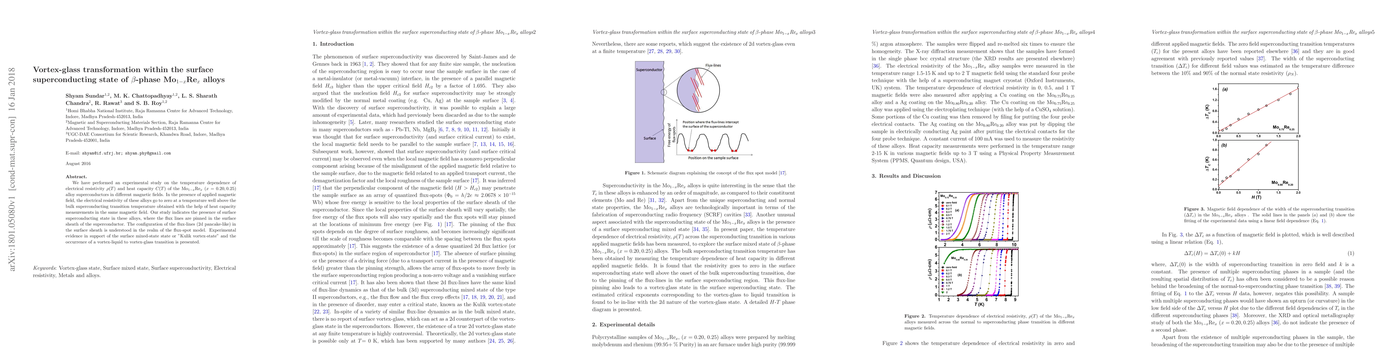 This study investigates the temperature-dependent electrical resistivity and heat capacity of Mo$_{1-x}$Re$_x$ alloy superconductors, revealing a surface superconducting state where flux lines are pinned. The research provides evidence for a vortex-liquid to vortex-glass transition in the surface mixed state, supporting the flux-spot model.
