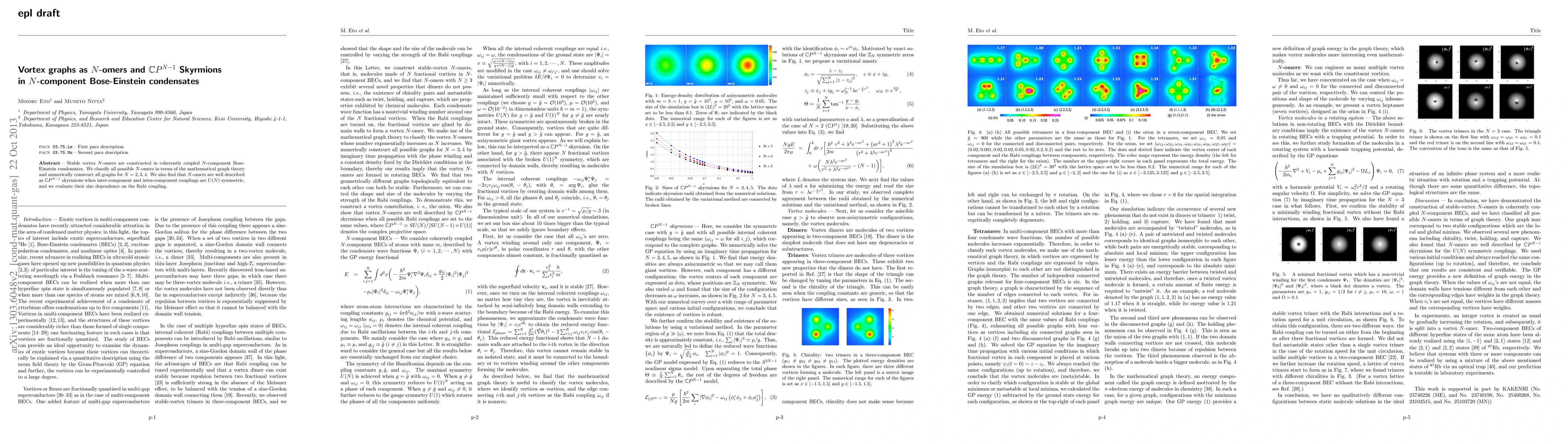 This paper constructs stable vortex N-omers in N-component Bose-Einstein condensates, classifying them using graph theory and numerically identifying them for N=2,3,4. It also demonstrates that these N-omers can be described as CP(N-1) skyrmions under U(N) symmetry and analyzes their size dependence on Rabi coupling.