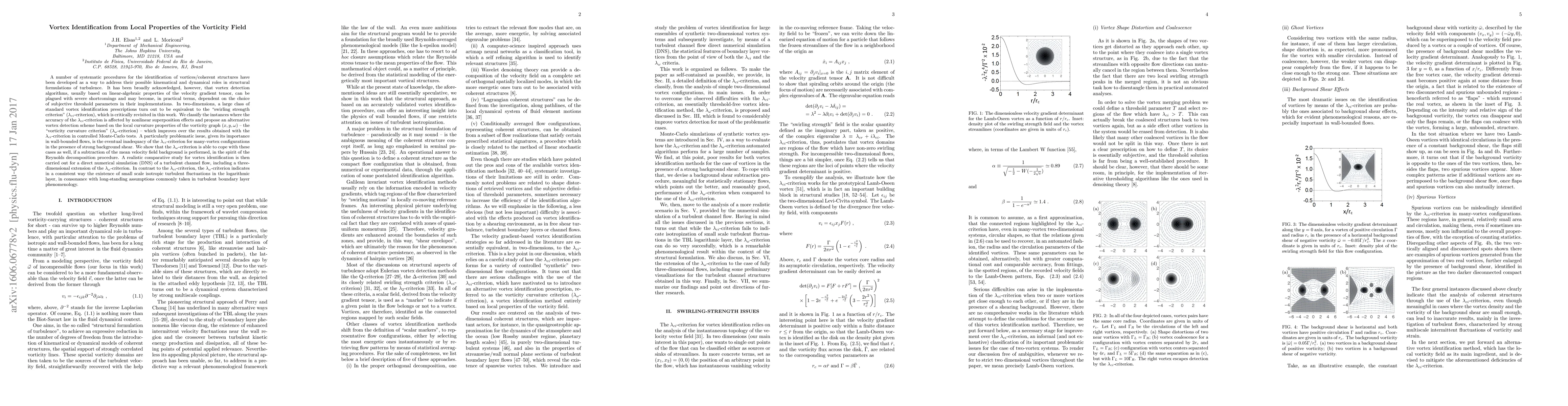 It has been broadly acknowledged that vortex detection algorithms, usually based on linear-algebraic properties of the velocity gradient tensor, can be plagued with severe shortcomings and may become, in practical terms, dependent on the choice of subjective threshold parameters in their implementations. In two-dimensions, a large class of standard vortex identification prescriptions turn out to be equivalent to the "swirling strength criterion" ($\lambda_{ci}$-criterion), which is critically revisited in this work. We classify the instances where the accuracy of the $\lambda_{ci}$-criterion is affected by nonlinear superposition effects and propose an alternative vortex detection scheme based on the local curvature properties of the vorticity graph $(x,y,\omega)$ -- the "vorticity curvature criterion" ($\lambda_\omega$-criterion) -- which improves over the results obtained with the $\lambda_{ci}$-criterion in controlled Monte-Carlo tests. We show that the $\lambda_\omega$-criterion is able to cope with strong shear effects, if a subtraction of the mean velocity field background is performed, in the spirit of the Reynolds decomposition procedure. A realistic comparative study for vortex identification is then carried out for a direct numerical simulation (DNS) of a turbulent channel flow, including a three-dimensional extension of the $\lambda_\omega$-criterion. In contrast to the $\lambda_{ci}$-criterion, the $\lambda_\omega$-criterion indicates in a consistent way the existence of small scale isotropic turbulent fluctuations in the logarithmic layer, in consonance with long-standing assumptions commonly taken in turbulent boundary layer phenomenology.