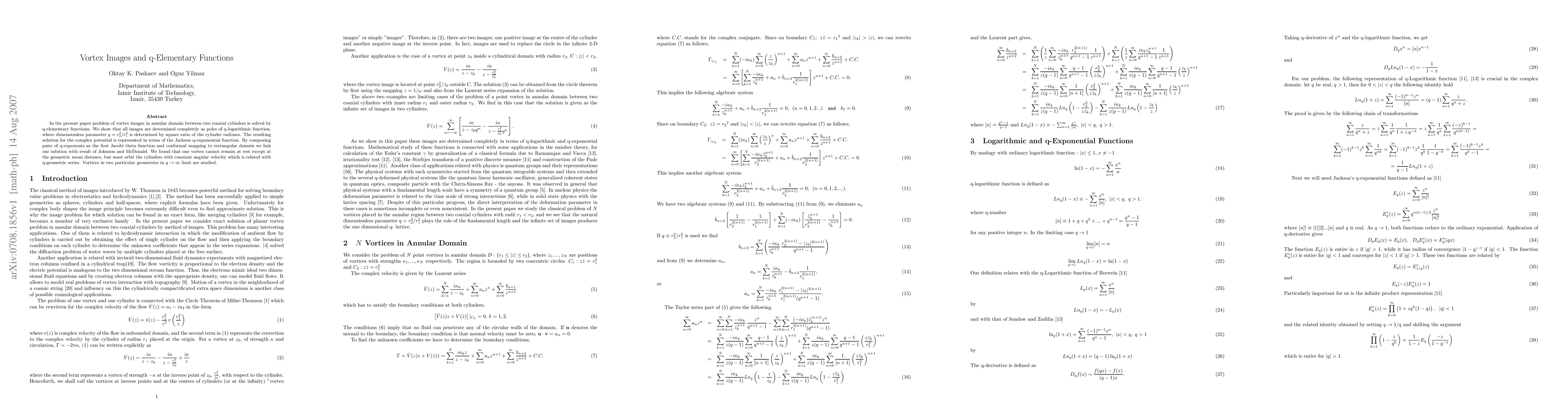 The paper solves vortex images between two coaxial cylinders using q-elementary functions, finding that vortices can only remain at rest at the geometric mean distance and must orbit with constant angular velocity in relation to the dimensionless parameter $q$.