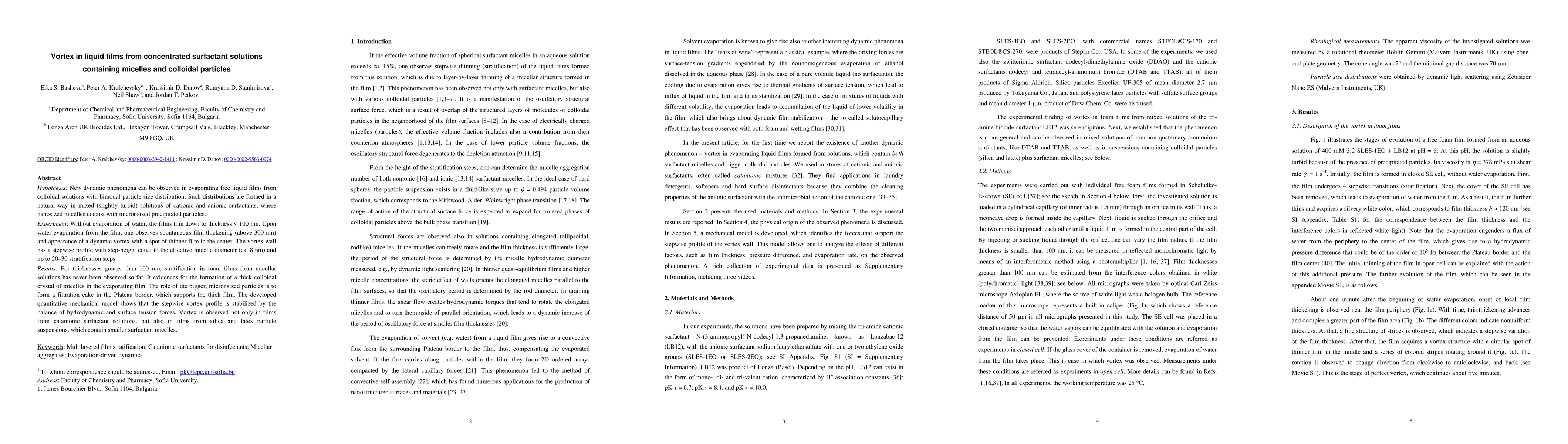 This paper investigates dynamic phenomena in evaporating liquid films from surfactant solutions containing both micelles and colloidal particles. It reveals the formation of a dynamic vortex with a central thinner film spot, stabilized by a balance of hydrodynamic and surface tension forces, and supported by a filtration cake of larger particles.