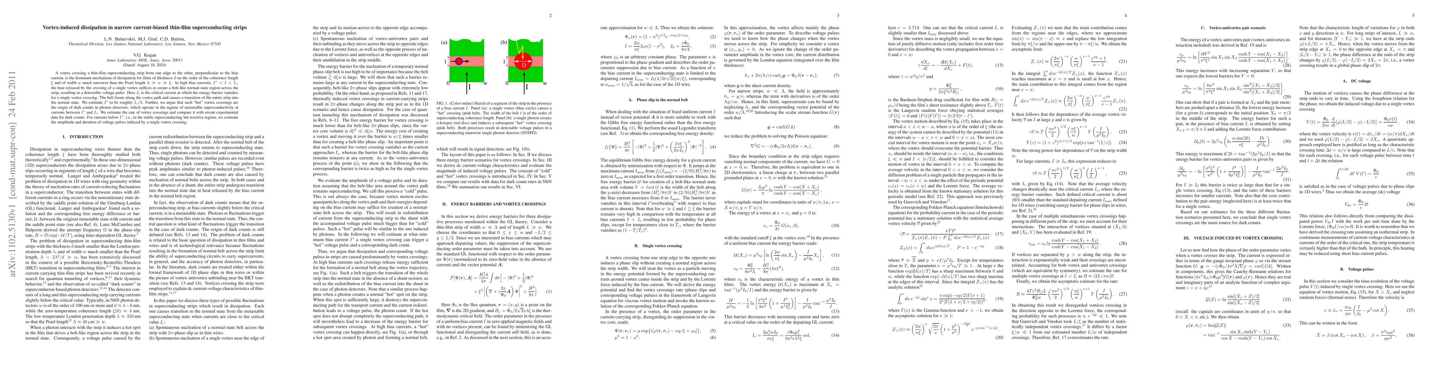 This paper investigates the dissipation mechanism in narrow, current-biased thin-film superconducting strips, where vortex crossings induce detectable voltage pulses due to heat release, leading to normal-state transitions. It estimates the critical current threshold for vortex-induced dissipation and links it to dark counts in photon detectors.