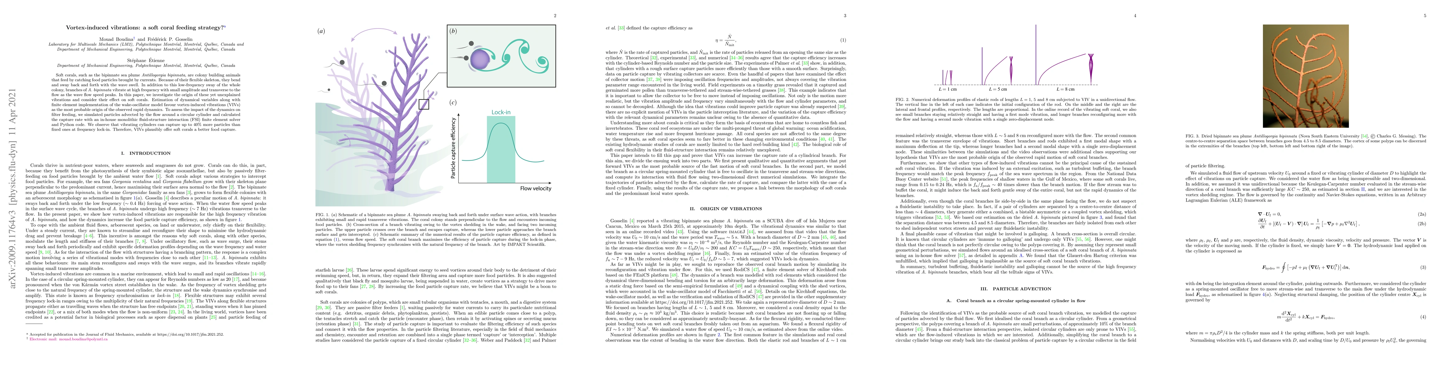 Soft corals, such as the bipinnate sea plume Antillogorgia bipinnata, are colony building animals that feed by catching food particles brought by currents. Because of their flexible skeleton, they bend and sway back and forth with the wave swell. In addition to this low-frequency sway of the whole colony, branches of A. bipinnata vibrate at high frequency with small amplitude and transverse to the flow as the wave flow speed peaks. In this paper, we investigate the origin of these yet unexplained vibrations and consider their effect on soft corals. Estimation of dynamical variables along with finite element implementation of the wake-oscillator model favour vortex-induced vibrations (VIVs) as the most probable origin of the observed rapid dynamics. To assess the impact of the dynamics on filter feeding, we simulated particles advected by the flow around a circular cylinder and calculated the capture rate with an in-house monolithic fluid-structure interaction (FSI) finite element solver and Python code. We observe that vibrating cylinders can capture up to 40% more particles than fixed ones at frequency lock-in. Therefore, VIVs plausibly offer soft corals a better food capture.