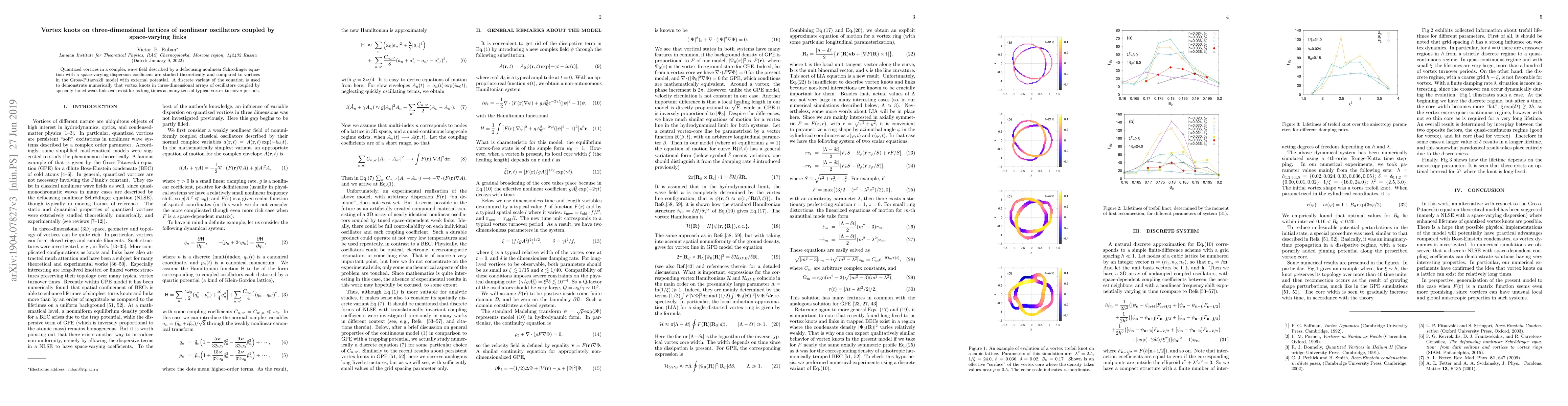 This paper investigates quantized vortices in a nonlinear Schrödinger equation with varying dispersion, demonstrating that vortex knots can persist in three-dimensional lattices of coupled nonlinear oscillators with specially tuned weak links, numerically showing stability for tens of vortex turnover periods.