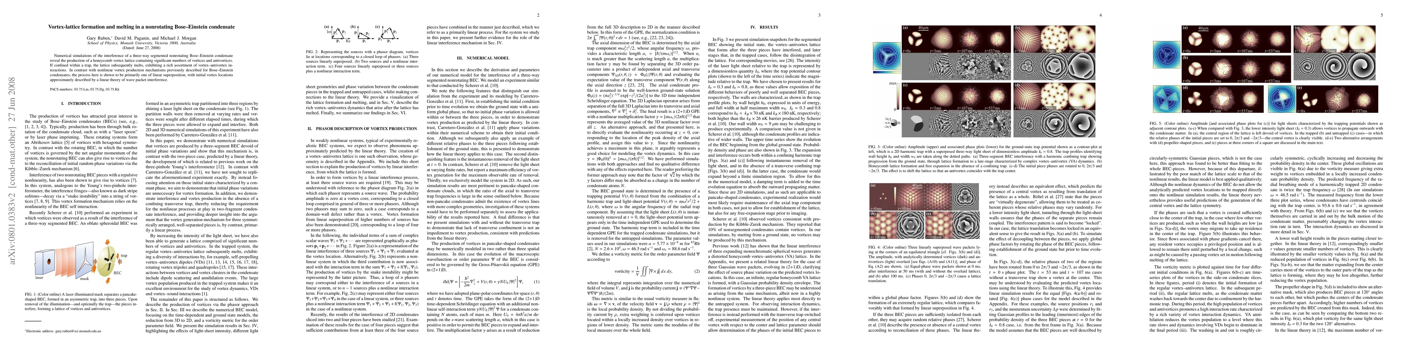 This research investigates the formation and melting of a vortex lattice in a nonrotating Bose-Einstein condensate, revealing a honeycomb structure via interference of three segments. The lattice melts within a trap, displaying complex vortex-antivortex interactions, primarily resulting from linear superposition rather than nonlinear mechanisms.
