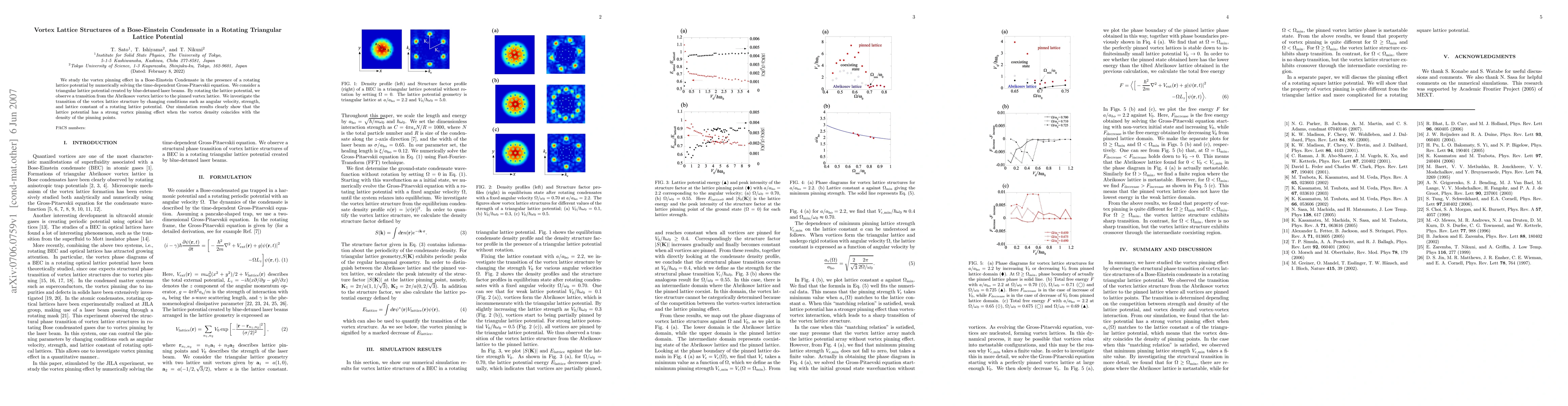This paper investigates the vortex pinning effect in a Bose-Einstein Condensate within a rotating triangular lattice potential, revealing a transition from Abrikosov to pinned vortex lattices. Numerical simulations show that strong vortex pinning occurs when vortex density matches the pinning points' density.