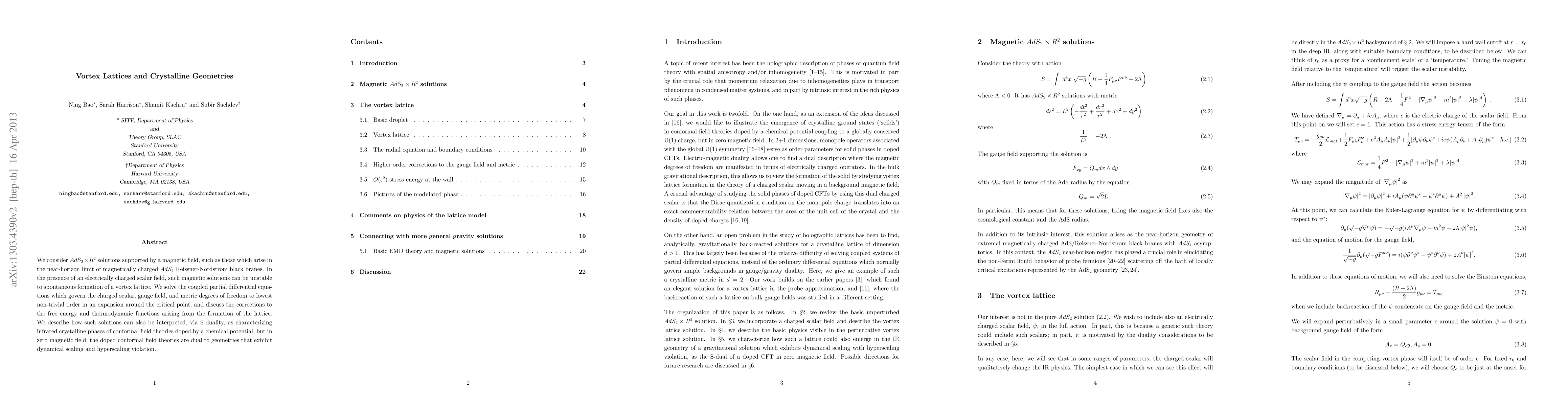 We consider $AdS_2 \times R^2$ solutions supported by a magnetic field, such as those which arise in the near-horizon limit of magnetically charged $AdS_4$ Reissner-Nordstrom black branes. In the presence of an electrically charged scalar field, such magnetic solutions can be unstable to spontaneous formation of a vortex lattice. We solve the coupled partial differential equations which govern the charged scalar, gauge field, and metric degrees of freedom to lowest non-trivial order in an expansion around the critical point, and discuss the corrections to the free energy and thermodynamic functions arising from the formation of the lattice. We describe how such solutions can also be interpreted, via S-duality, as characterizing infrared crystalline phases of conformal field theories doped by a chemical potential, but in zero magnetic field; the doped conformal field theories are dual to geometries that exhibit dynamical scaling and hyperscaling violation.