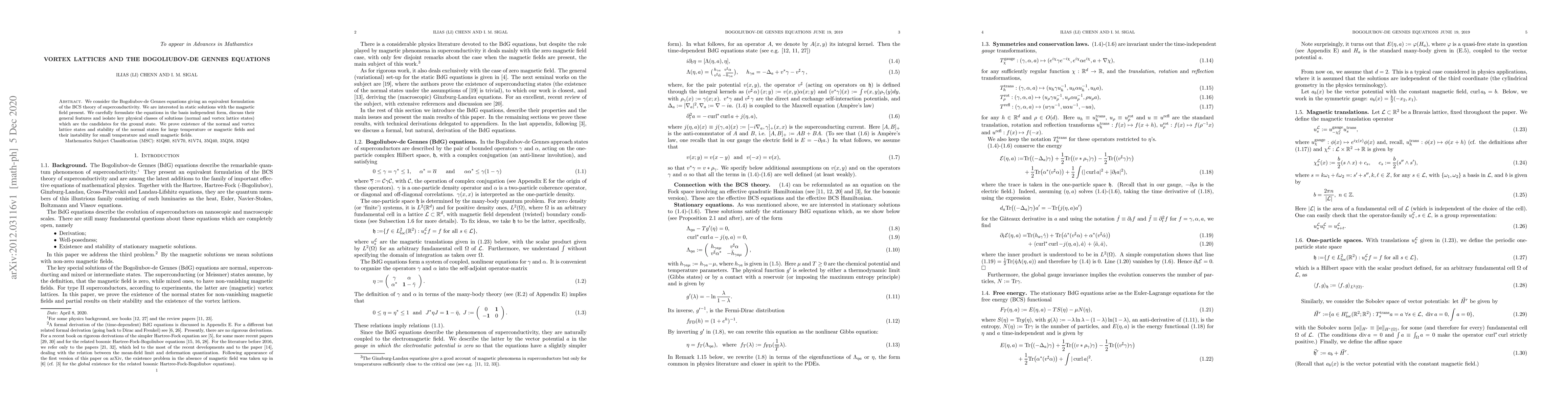 This paper explores the Bogoliubov-de Gennes equations as an alternative formulation of BCS theory of superconductivity, focusing on static solutions in the presence of a magnetic field. It identifies normal and vortex lattice states as potential ground states, proving the existence and stability of normal states under high temperature or magnetic conditions, while vortex lattices become unstable under low temperature and magnetic fields.
