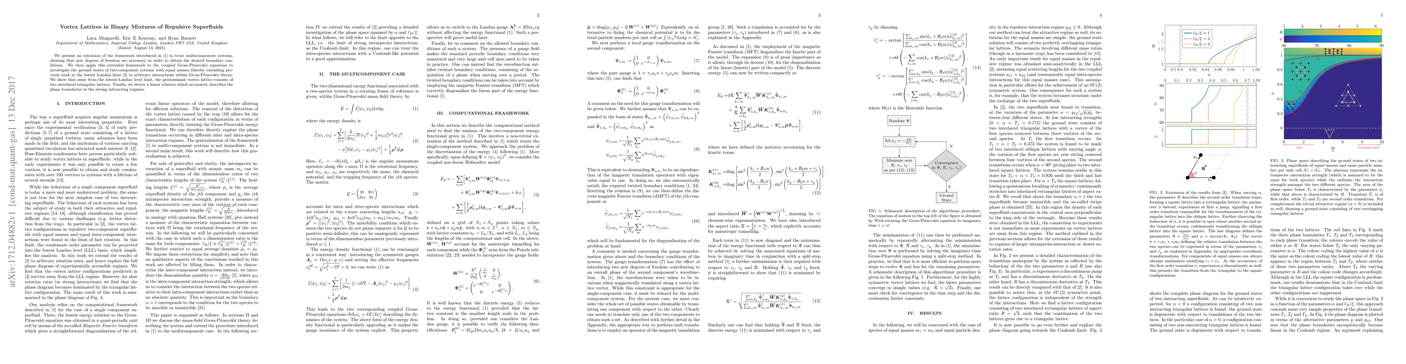 We present an extension of the framework introduced in [1] to treat multicomponent systems, showing that new degrees of freedom are necessary in order to obtain the desired boundary conditions. We then apply this extended framework to the coupled Gross-Pitaevskii equations to investigate the ground states of two-component systems with equal masses thereby extending previous work in the lowest Landau limit [2] to arbitrary interactions within Gross-Pitaevskii theory. We show that away from the lowest-Landau level limit, the predominant vortex lattice consists of two interlaced triangular lattices. Finally, we derive a linear relation which accurately describes the phase boundaries in the strong interacting regimes.