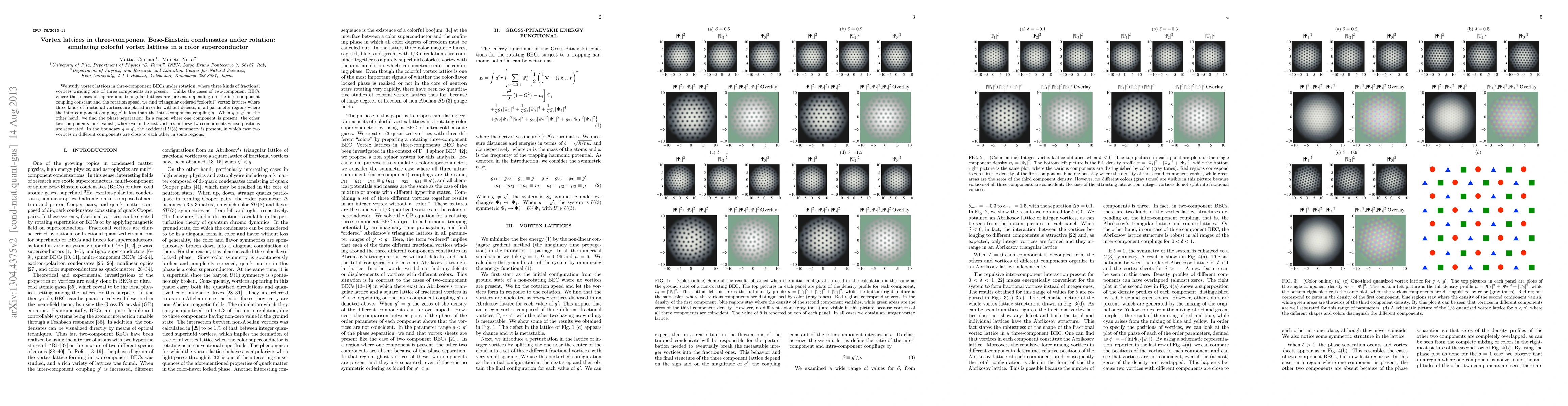 We study vortex lattices in three-component BECs under rotation, where three kinds of fractional vortices winding one of three components are present. Unlike the cases of two-component BECs where the phases of square and triangular lattices are present depending on the intercomponent coupling constant and the rotation speed, we find triangular ordered "colorful" vortex lattices where three kind of fractional vortices are placed in order without defects, in all parameter region where the inter-component coupling g' is less than the intra-component coupling g. When g > g' on the other hand, we find the phase separation; In a region where one component is present, the other two components must vanish, where we find ghost vortices in these two components whose positions are separated. In the boundary g = g', the accidental U(3) symmetry is present, in which case two vortices in different components are close to each other in some regions.