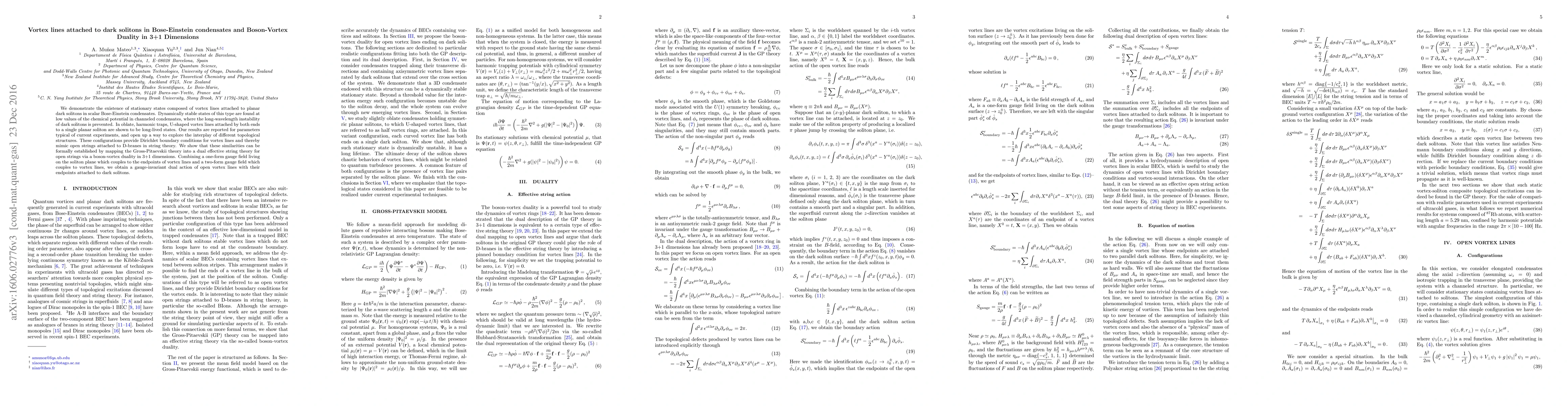We demonstrate the existence of stationary states composed of vortex lines attached to planar dark solitons in scalar Bose-Einstein condensates. Dynamically stable states of this type are found at low values of the chemical potential in channeled condensates, where the long-wavelength instability of dark solitons is prevented. In oblate, harmonic traps, U-shaped vortex lines attached by both ends to a single planar soliton are shown to be long-lived states. Our results are reported for parameters typical of current experiments, and open up a way to explore the interplay of different topological structures. These configurations provide Dirichlet boundary conditions for vortex lines and thereby mimic open strings attached to D-branes in string theory. We show that these similarities can be formally established by mapping the Gross-Pitaevskii theory into a dual effective string theory for open strings via a boson-vortex duality in 3+1 dimensions. Combining a one-form gauge field living on the soliton plane which couples to the endpoints of vortex lines and a two-form gauge field which couples to vortex lines, we obtain a gauge-invariant dual action of open vortex lines with their endpoints attached to dark solitons.