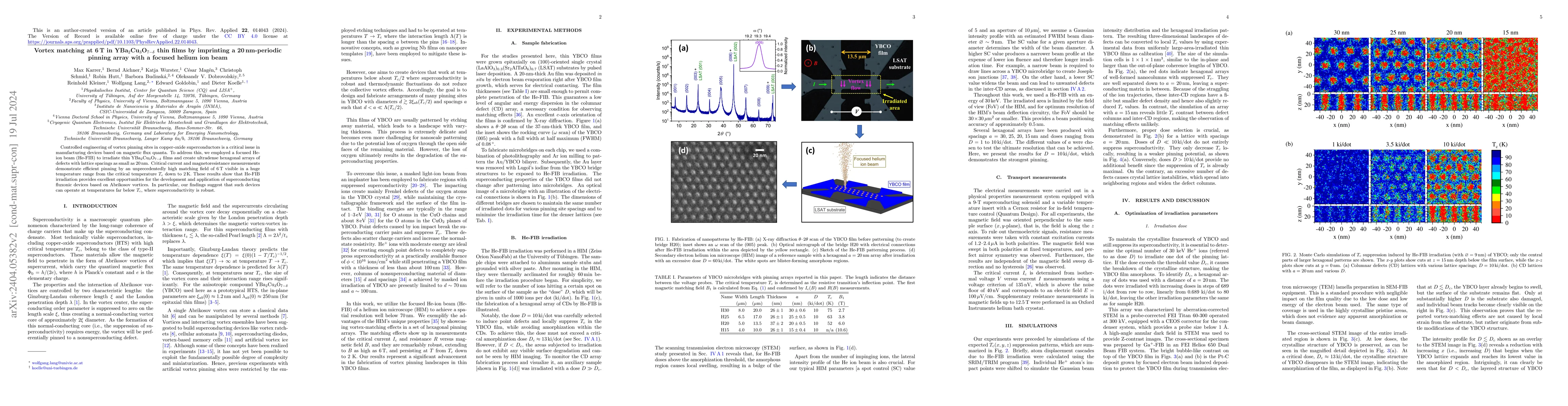 The study utilized a focused helium ion beam to create 20 nm-periodic pinning arrays in YBa$_2$Cu$_3$O$_{7-\delta}$ thin films, achieving vortex matching at 6 T and demonstrating effective pinning across a broad temperature range. This technique holds promise for the development of superconducting fluxonic devices operating well below the critical temperature.