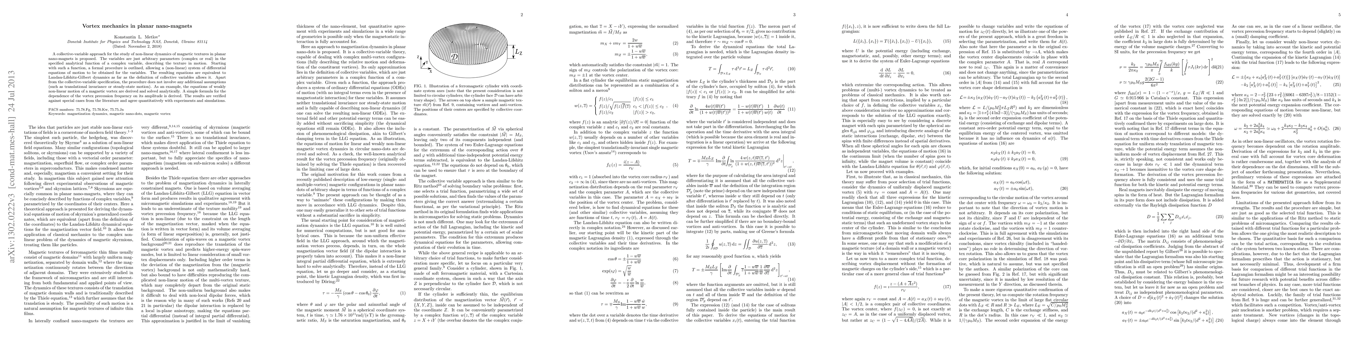 A collective-variable approach for the study of non-linear dynamics of magnetic textures in planar nano-magnets is proposed. The variables are just arbitrary parameters (complex or real) in the specified analytical function of a complex variable, describing the texture in motion. Starting with such a function, a formal procedure is outlined, allowing a (non-linear) system of differential equations of motion to be obtained for the variables. The resulting equations are equivalent to Landau-Lifshitz-Gilbert dynamics as far as the definition of collective variables allows it. Apart from the collective-variable specification, the procedure does not involve any additional assumptions (such as translational invariance or steady-state motion). As an example, the equations of weakly non-linear motion of a magnetic vortex are derived and solved analytically. A simple formula for the dependence of the vortex precession frequency on its amplitude is derived. The results are verified against special cases from the literature and agree quantitatively with experiments and simulations.