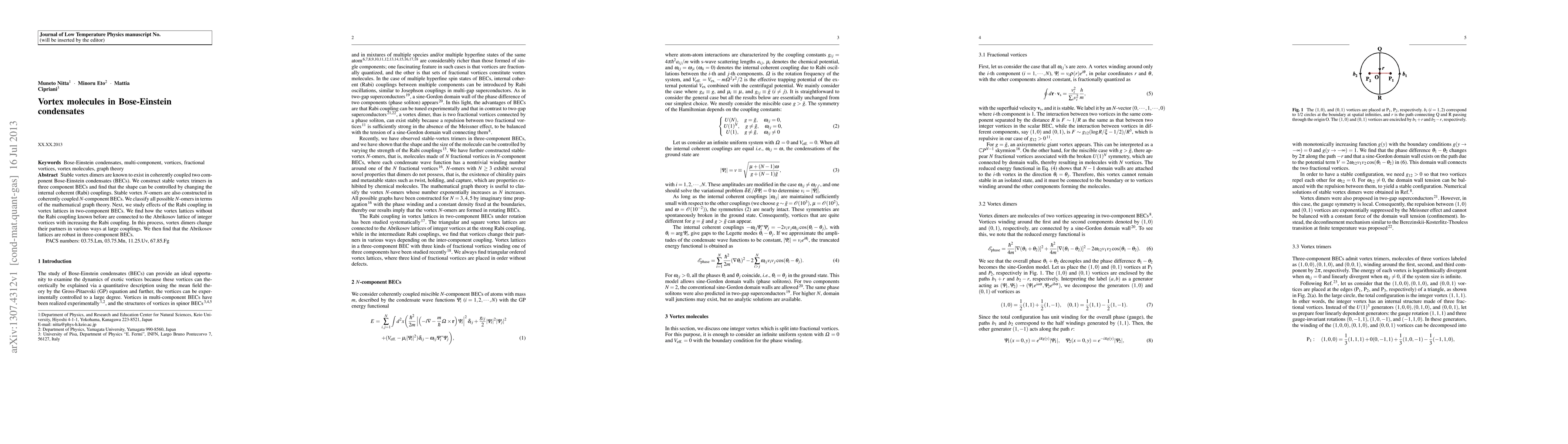 Stable vortex dimers are known to exist in coherently coupled two component Bose-Einstein condensates (BECs). We construct stable vortex trimers in three component BECs and find that the shape can be controlled by changing the internal coherent (Rabi) couplings. Stable vortex N-omers are also constructed in coherently coupled N-component BECs. We classify all possible N-omers in terms of the mathematical graph theory. Next, we study effects of the Rabi coupling in vortex lattices in two-component BECs. We find how the vortex lattices without the Rabi coupling known before are connected to the Abrikosov lattice of integer vortices with increasing the Rabi coupling. In this process, vortex dimers change their partners in various ways at large couplings. We then find that the Abrikosov lattices are robust in three-component BECs.
