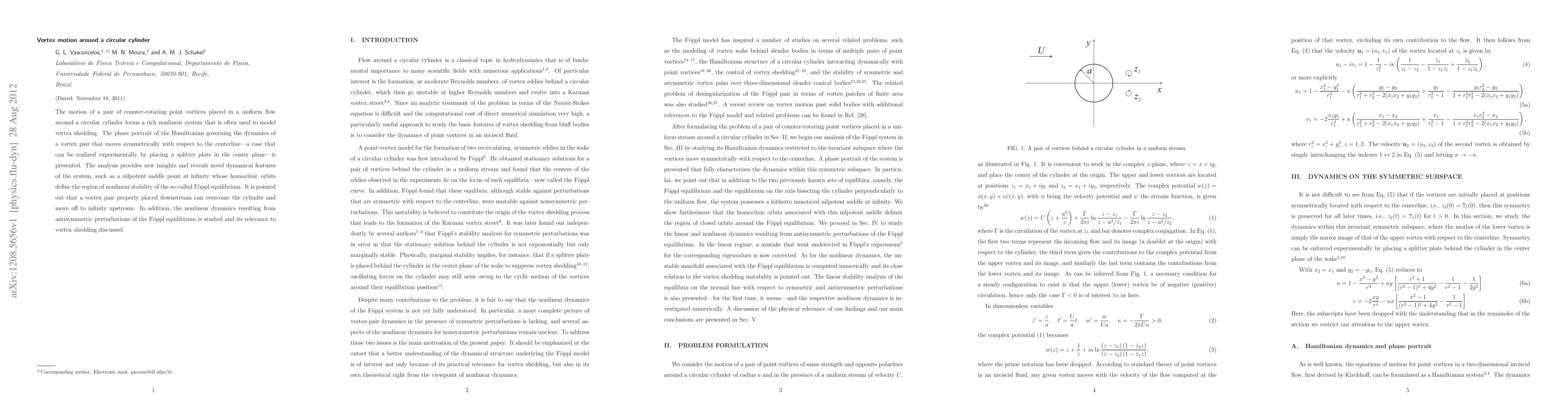 This paper analyzes the nonlinear dynamics of a pair of counter-rotating vortices in uniform flow around a circular cylinder, revealing novel features such as a nilpotent saddle point and its role in vortex shedding. It explores how perturbations can affect the Föppl equilibrium and the potential for vortex pairs to escape upstream.