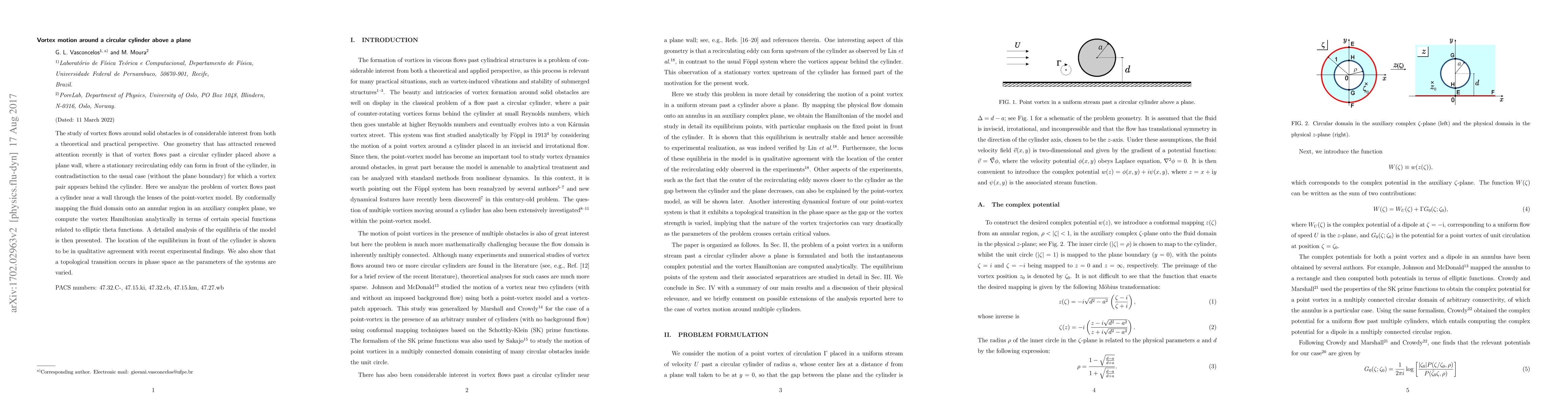 This paper investigates vortex flows around a circular cylinder above a plane using the point-vortex model, analytically computing the vortex Hamiltonian and analyzing equilibria. The study reveals a stationary recirculating eddy in front of the cylinder, differing from typical vortex pairs, and identifies a topological transition in phase space with varying parameters.