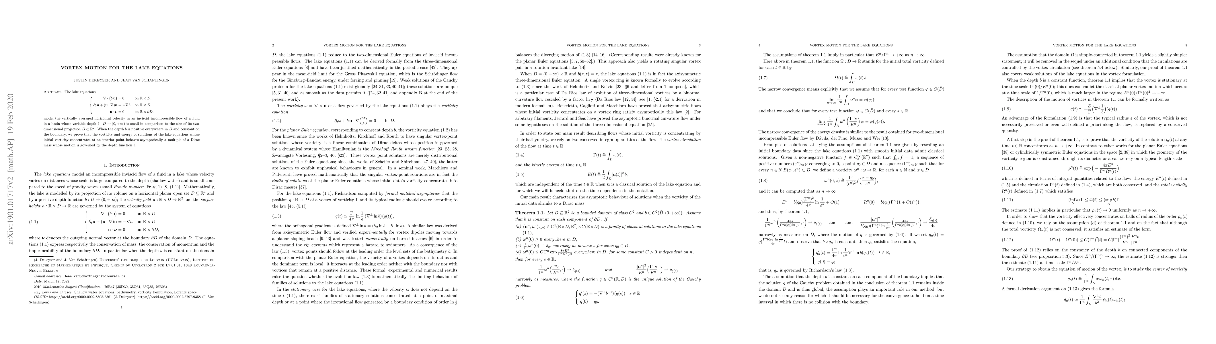 The lake equations $$\left\{\begin{aligned} \nabla \cdot \big( b \, \mathbf{u}\big) &= 0 & & \text{on}\ \mathbb{R}\times D,\\ \partial_t\mathbf{u} + (\mathbf{u}\cdot \nabla)\mathbf{u} &= -\nabla h & & \text{on}\ \mathbb{R}\times D ,\\ \mathbf{u} \cdot \boldsymbol{\nu} &= 0 & & \text{on}\ \mathbb{R}\times\partial D . \end{aligned}\right.$$ model the vertically averaged horizontal velocity in an inviscid incompressible flow of a fluid in a basin whose variable depth $b : D \to [0, + \infty)$ is small in comparison with the size of its two-dimensional projection $D \subset \mathbb{R}^2$. When the depth $b$ is positive everywhere in $D$ and constant on the boundary, we prove that the vorticity of solutions of the lake equations whose initial vorticity concentrates at an interior point is asympotically a multiple of a Dirac mass whose motion is governed by the depth function $b$.