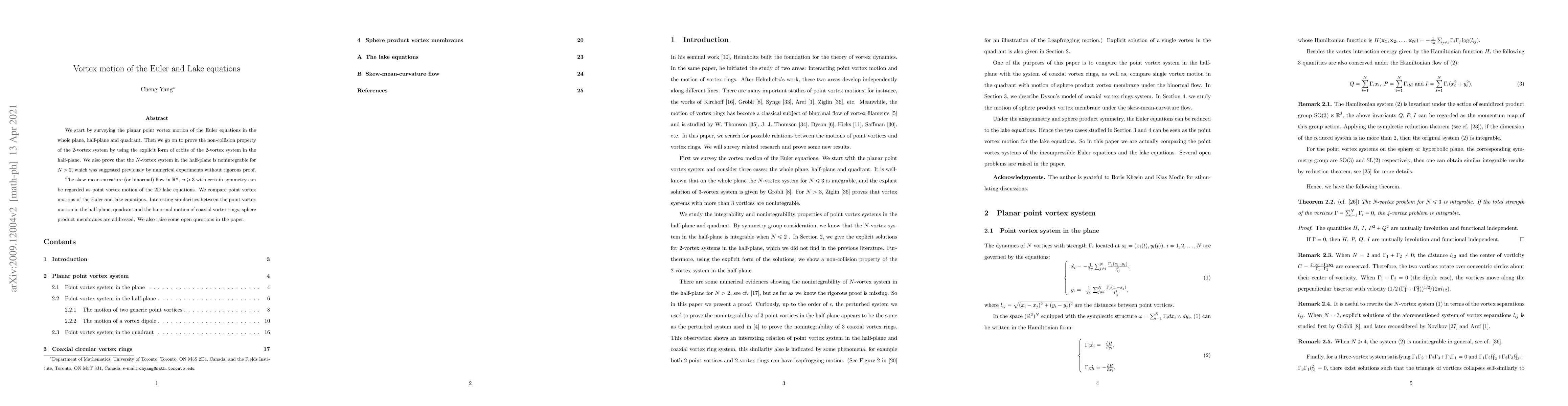 We start by surveying the planar point vortex motion of the Euler equations in the whole plane, half-plane and quadrant. Then we go on to prove non-collision property of 2-vortex system by using the explicit form of orbits of 2-vortex system in the half-plane. We also prove that the $N$-vortex system in the half-plane is nonintegrable for $N>2$, which is suggested previously by numerical experiments without rigorous proof. The skew-mean-curvature (or binormal) flow in $\mathbb R^n,\;n\geq3$ with certain symmetry can be regarded as point vortex motion of the 2D lake equations. We compare point vortex motions of the Euler and lake equations. Interesting similarities between the point vortex motion in the half-plane, quadrant and the binormal motion of coaxial vortex rings, sphere product membranes are addressed. We also raise some open questions in the paper.