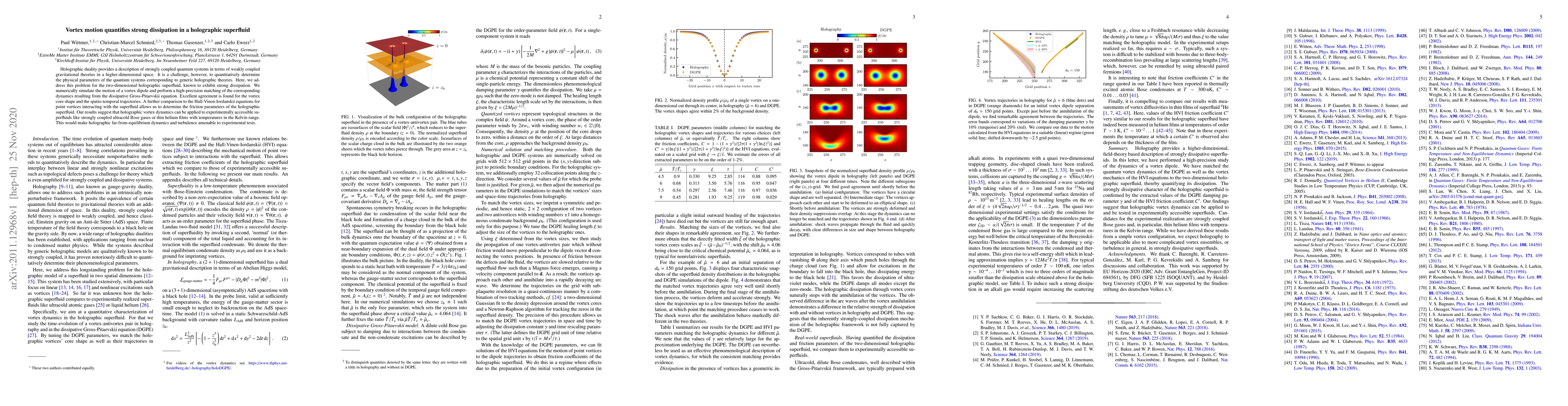 Holographic duality provides a description of strongly coupled quantum systems in terms of weakly coupled gravitational theories in a higher-dimensional space. It is a challenge, however, to quantitatively determine the physical parameters of the quantum systems corresponding to generic holographic theories. Here, we address this problem for the two-dimensional holographic superfluid, known to exhibit strong dissipation. We numerically simulate the motion of a vortex dipole and perform a high-precision matching of the corresponding dynamics resulting from the dissipative Gross-Pitaevskii equation. Excellent agreement is found for the vortex core shape and the spatio-temporal trajectories. A further comparison to the Hall-Vinen-Iordanskii equations for point vortices interacting with the superfluid allows us to determine the friction parameters of the holographic superfluid. Our results suggest that holographic vortex dynamics can be applied to experimentally accessible superfluids like strongly coupled ultracold Bose gases or thin helium films with temperatures in the Kelvin range. This would make holographic far-from-equilibrium dynamics and turbulence amenable to experimental tests.