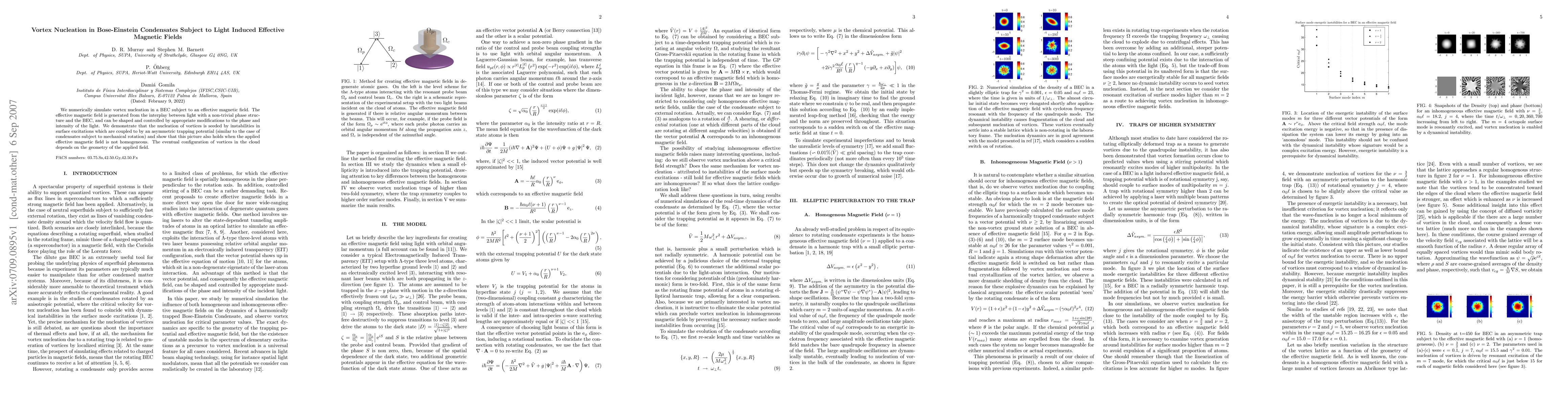 We numerically simulate vortex nucleation in a Bose-Einstein Condensate (BEC) subject to an effective magnetic field. The effective magnetic field is generated from the interplay between light with a non-trivial phase structure and the BEC, and can be shaped and controlled by appropriate modifications to the phase and intensity of the light. We demonstrate that the nucleation of vortices is seeded by instabilities in surface excitations which are coupled to by an asymmetric trapping potential (similar to the case of condensates subject to mechanical rotation) and show that this picture also holds when the applied effective magnetic field is not homogeneous. The eventual configuration of vortices in the cloud depends on the geometry of the applied field.