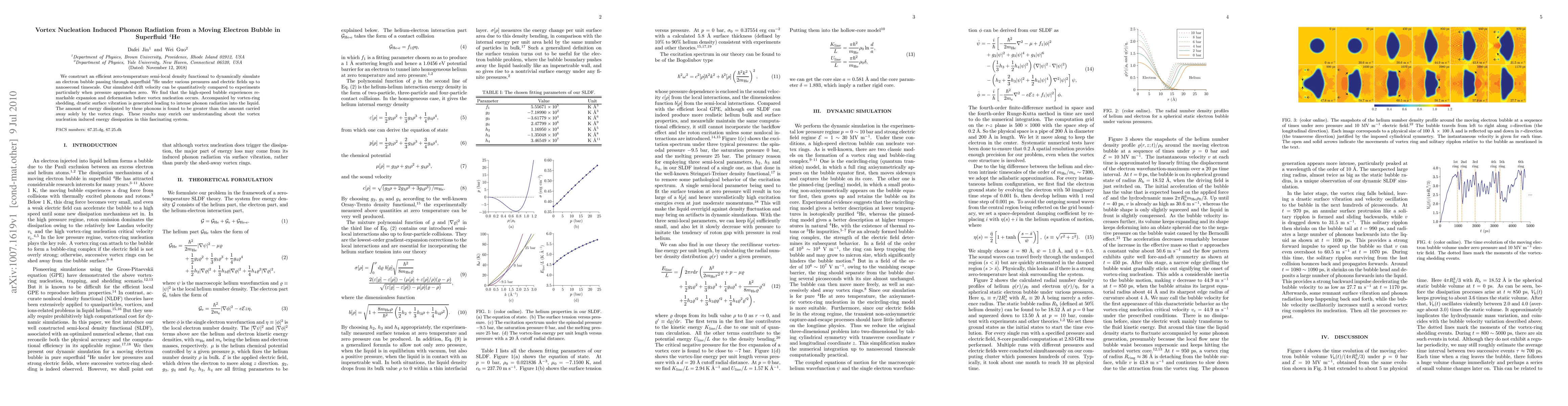 We construct an efficient zero-temperature semi-local density functional to dynamically simulate an electron bubble passing through superfluid 4He under various pressures and electric fields up to nanosecond timescale. Our simulated drift velocity can be quantitatively compared to experiments particularly when pressure approaches zero. We find that the high-speed bubble experiences remarkable expansion and deformation before vortex nucleation occurs. Accompanied by vortex-ring shedding, drastic surface vibration is generated leading to intense phonon radiation into the liquid. The amount of energy dissipated by these phonons is found to be greater than the amount carried away solely by the vortex rings. These results may enrich our understanding about the vortex nucleation induced energy dissipation in this fascinating system.
