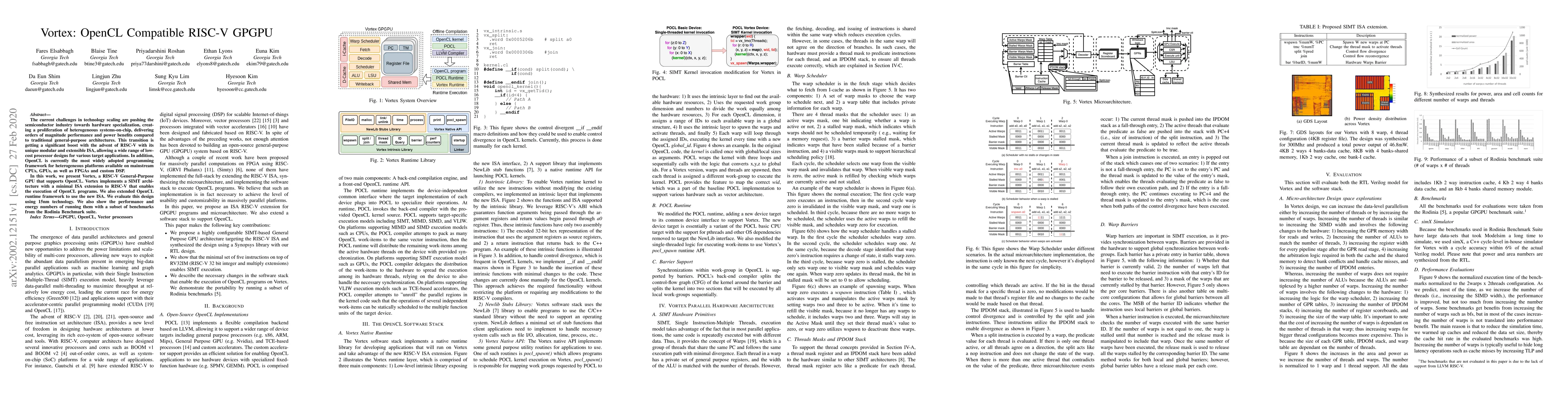 Vortex presents a RISC-V General-Purpose GPU with OpenCL compatibility, enabling efficient execution of OpenCL programs on a SIMT architecture. This design demonstrates significant performance and energy benefits, validated through a subset of Rodinia Benchmarks.