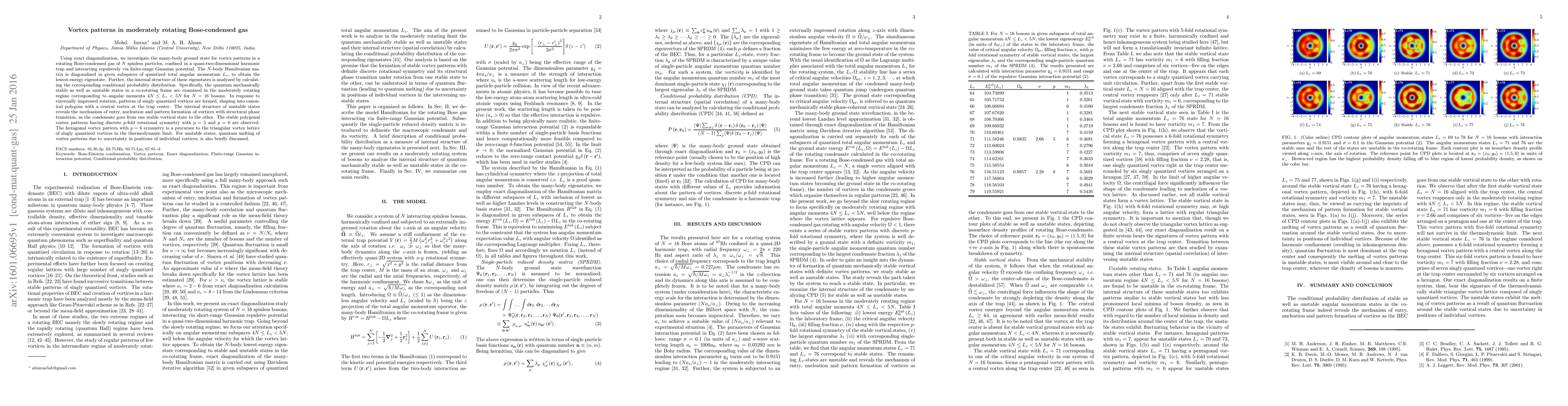The research employs exact diagonalization to investigate the many-body ground state for vortex patterns in a rotating Bose-condensed gas, considering subspaces of quantized total angular momentum Lz and calculating the conditional probability distribution to analyze the internal structure of eigenstates.