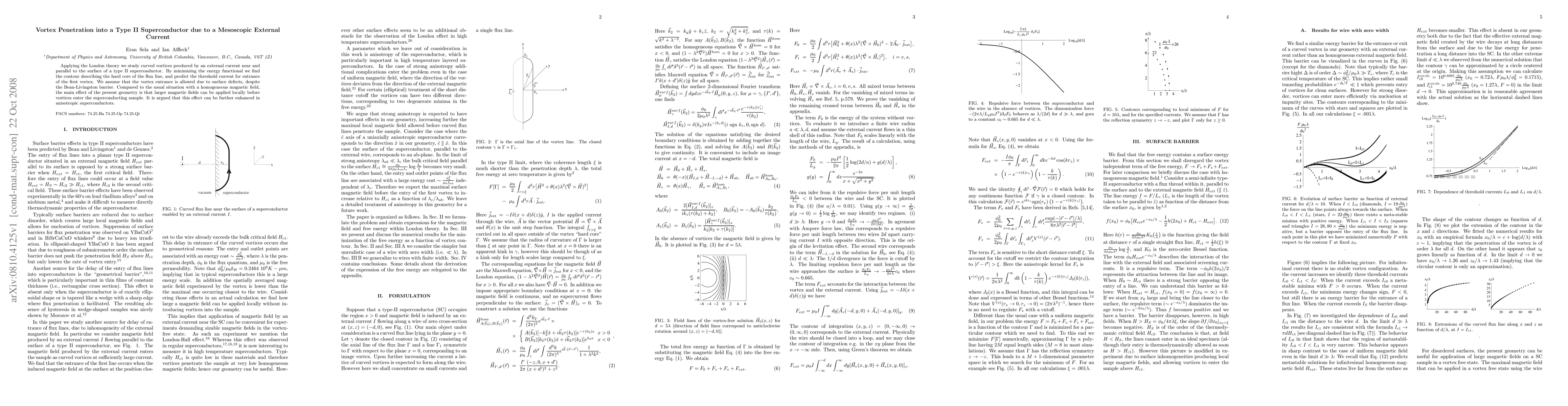 This study applies London theory to analyze curved vortices in type II superconductors under external currents near the surface, predicting threshold currents for vortex entry. It highlights the potential for applying larger magnetic fields locally in superconductors due to surface defects, with this effect potentially amplified in anisotropic superconductors.