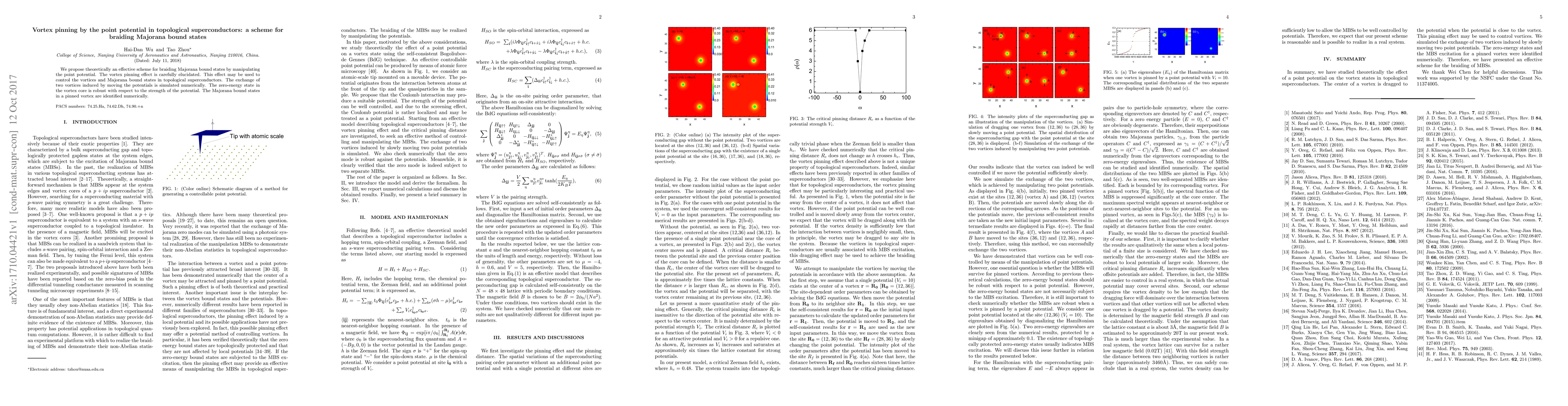 The paper proposes a theoretical scheme to braid Majorana bound states in topological superconductors by manipulating point potentials, utilizing the vortex pinning effect to control vortices and Majorana states. Numerical simulations confirm the robustness of the zero-energy state in vortex cores against potential strength and identify Majorana bound states in pinned vortices.