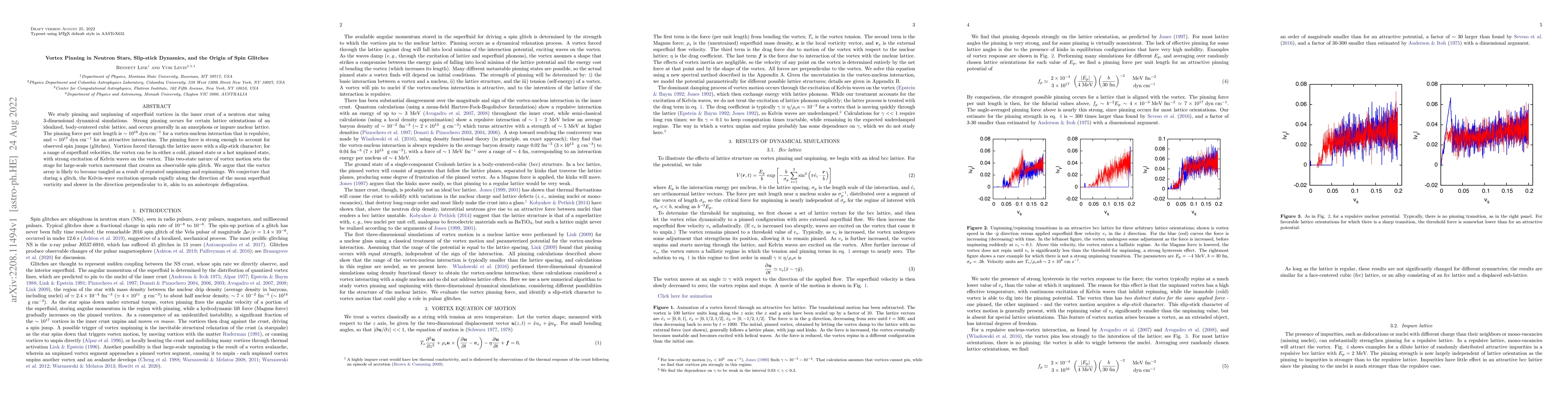 This paper investigates vortex pinning in neutron stars' inner crust, revealing that strong pinning forces can cause spin glitches. The study finds that vortex motion exhibits slip-stick dynamics, leading to observable spin jumps due to vortex tangles and rapid Kelvin wave excitations.