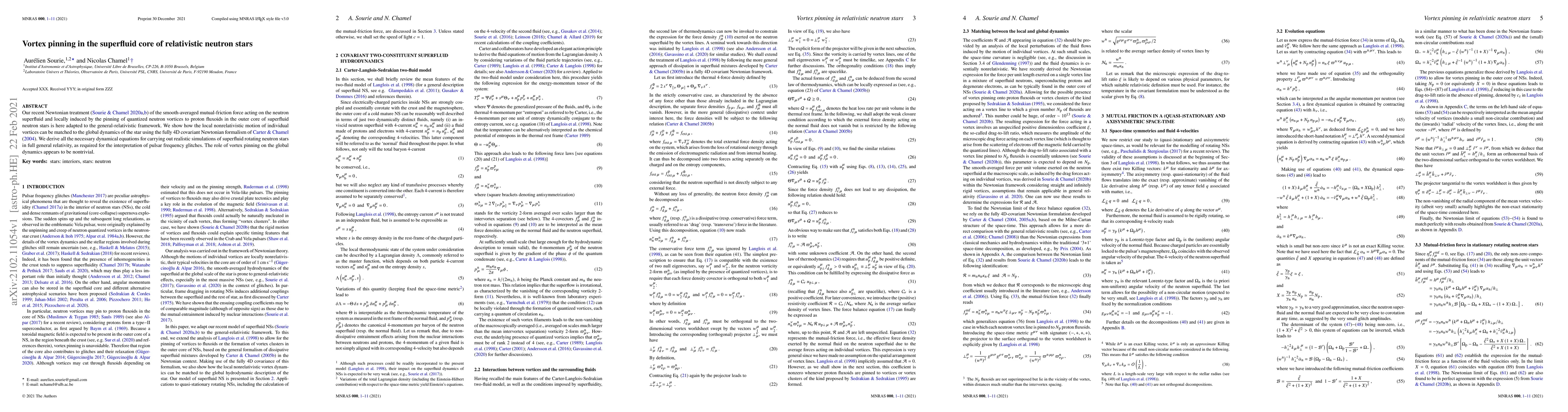 This paper adapts a Newtonian treatment of vortex pinning in neutron stars to a general-relativistic framework, deriving necessary dynamical equations for simulations of superfluid neutron stars. Vortex pinning's impact on the star's global dynamics is shown to be significant for interpreting pulsar frequency glitches.