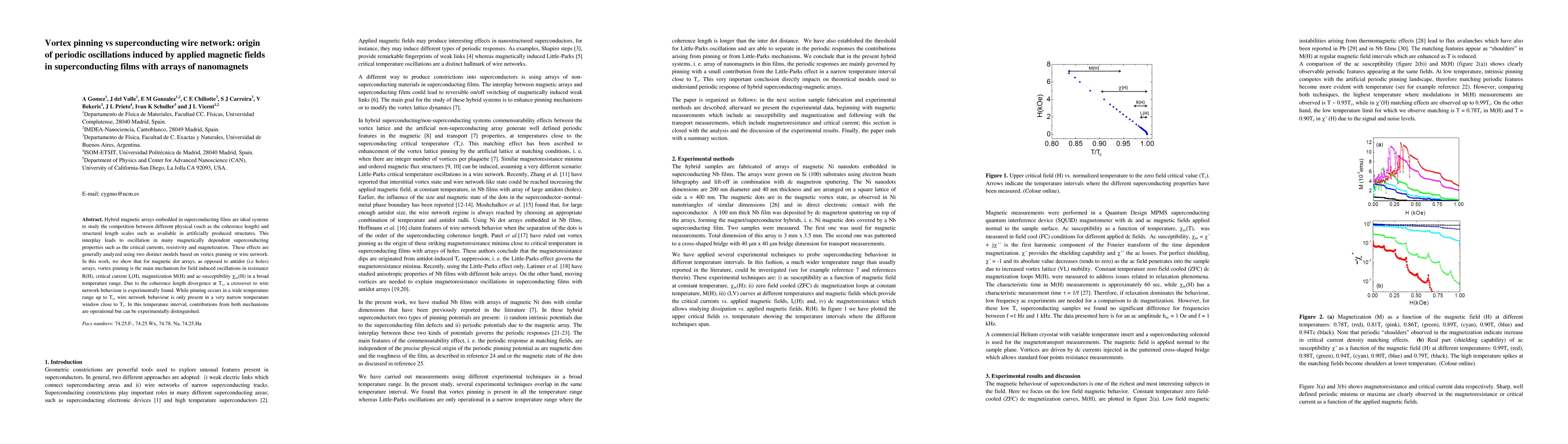 Hybrid magnetic arrays embedded in superconducting films are ideal systems to study the competition between different physical (such as the coherence length) and structural length scales such as available in artificially produced structures. This interplay leads to oscillation in many magnetically dependent superconducting properties such as the critical currents, resistivity and magnetization. These effects are generally analyzed using two distinct models based on vortex pinning or wire network. In this work, we show that for magnetic dot arrays, as opposed to antidot (i.e holes) arrays, vortex pinning is the main mechanism for field induced oscillations in resistance R(H), critical current Ic(H), magnetization M(H) and ac-susceptibility Xac(H) in a broad temperature range. Due to the coherence length divergence at Tc, a crossover to wire network behavior is experimentally found. While pinning occurs in a wide temperature range up to Tc, wire network behavior is only present in a very narrow temperature window close to Tc. In this temperature interval, contributions from both mechanisms are operational but can be experimentally distinguished.