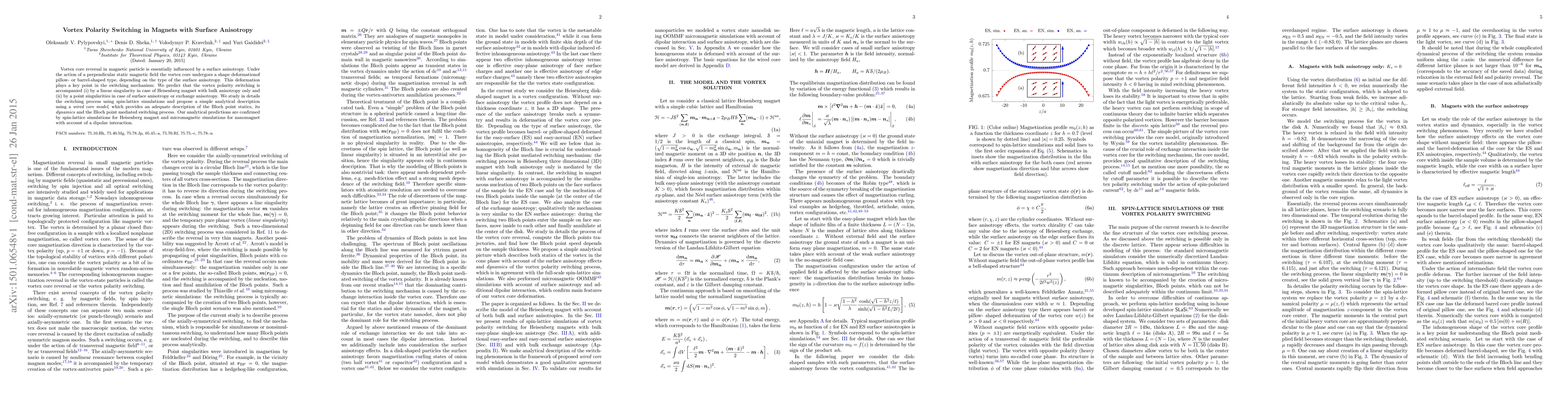 This paper investigates vortex polarity switching in magnetic particles influenced by surface anisotropy, predicting distinct singularity types for different anisotropies. Analytical and simulation models describe the vortex core deformation and switching mechanisms, validated by spin-lattice and micromagnetic simulations.