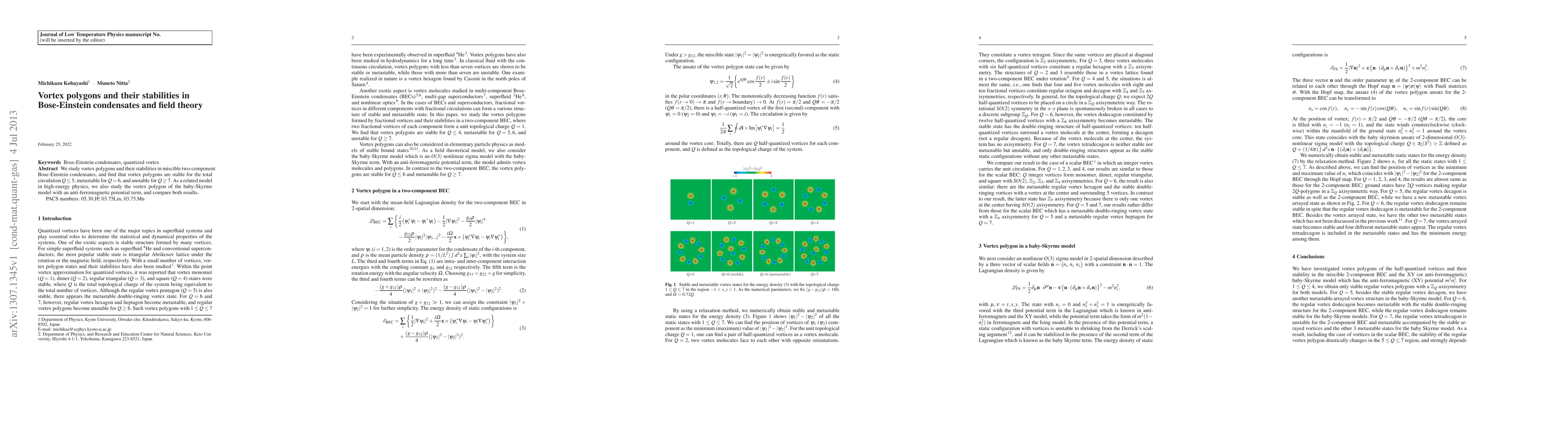 This paper investigates the stability of vortex polygons in miscible two-component Bose-Einstein condensates, finding stability for total circulation up to $Q = 5$, metastability at $Q = 6$, and instability for $Q \geq 7$. It also examines vortex polygons in the baby-Skyrme model with an anti-ferromagnetic potential, comparing results across both systems.