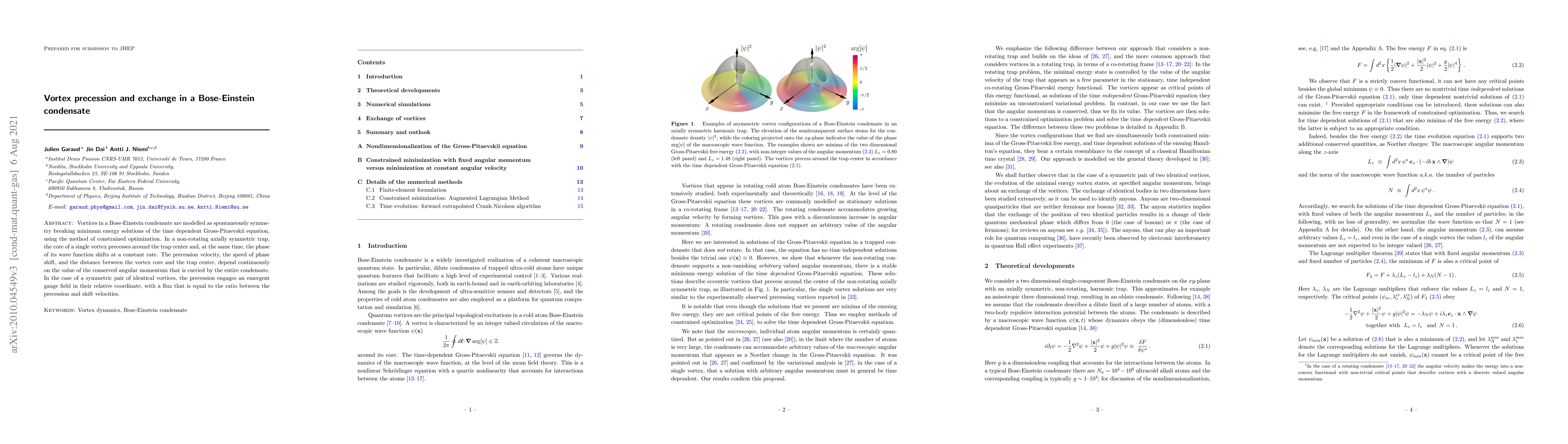 This paper models vortices in a Bose-Einstein condensate as minimum energy solutions of the time-dependent Gross-Pitaevskii equation, showing that vortex precession and phase shift rates are dependent on the condensate's angular momentum. In the case of a pair of identical vortices, the precession generates an emergent gauge field with a flux proportional to the ratio of precession and shift velocities.