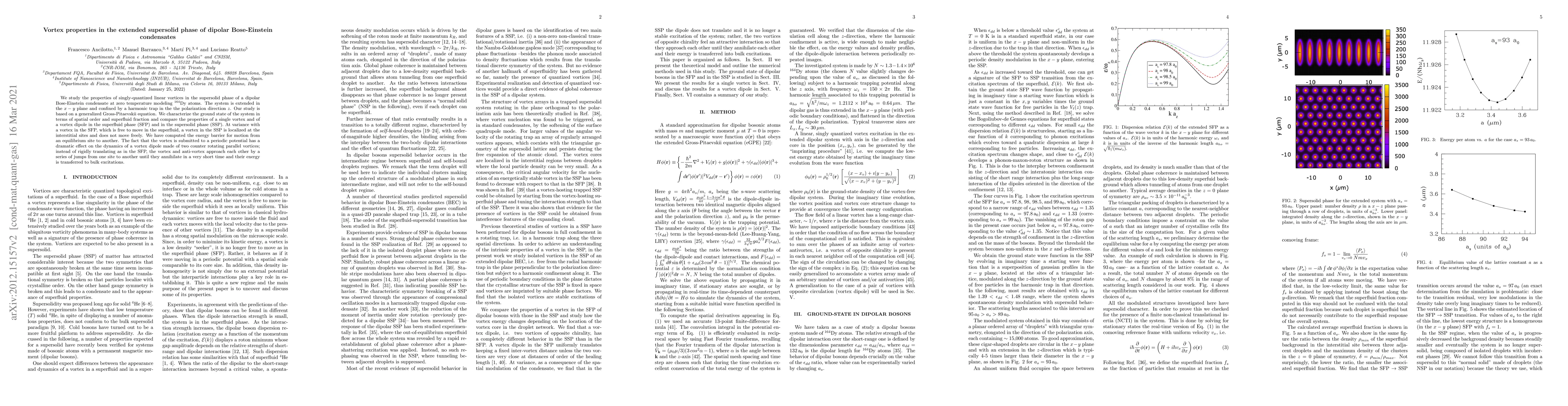 This paper investigates the behavior of linear vortices in the supersolid phase of dipolar Bose-Einstein condensates, finding that vortices are localized and do not move freely, unlike in the superfluid phase. The dynamics of a vortex dipole show a unique annihilation process involving jumps between sites, transferring energy to bulk excitations.