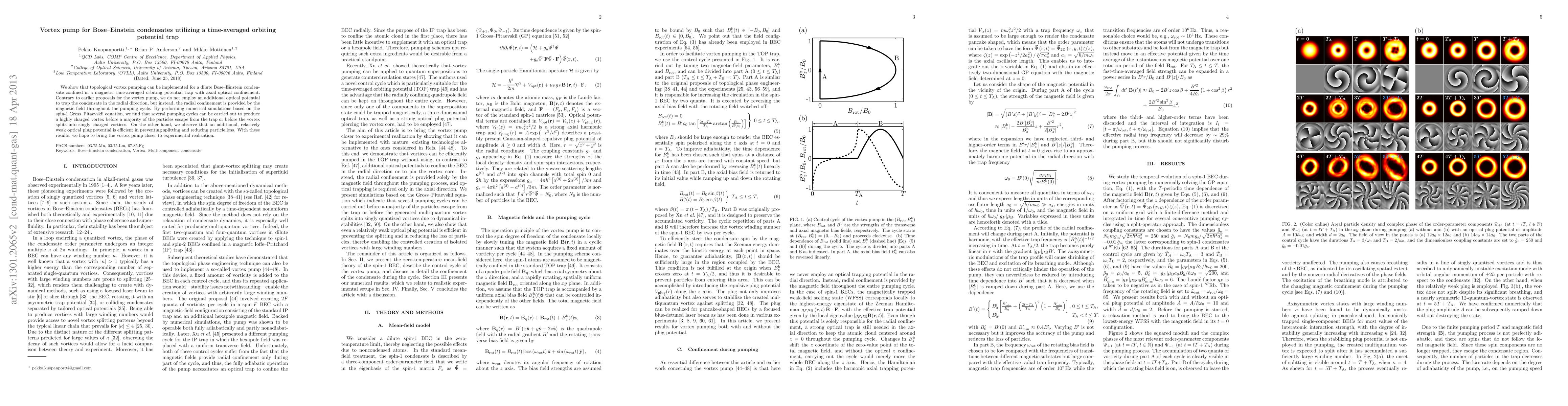 We show that topological vortex pumping can be implemented for a dilute Bose-Einstein condensate confined in a magnetic time-averaged orbiting potential trap with axial optical confinement. Contrary to earlier proposals for the vortex pump, we do not employ an additional optical potential to trap the condensate in the radial direction, but instead, the radial confinement is provided by the magnetic field throughout the pumping cycle. By performing numerical simulations based on the spin-1 Gross-Pitaevskii equation, we find that several pumping cycles can be carried out to produce a highly charged vortex before a majority of the particles escape from the trap or before the vortex splits into singly charged vortices. On the other hand, we observe that an additional, relatively weak optical plug potential is efficient in preventing splitting and reducing particle loss. With these results, we hope to bring the vortex pump closer to experimental realization.