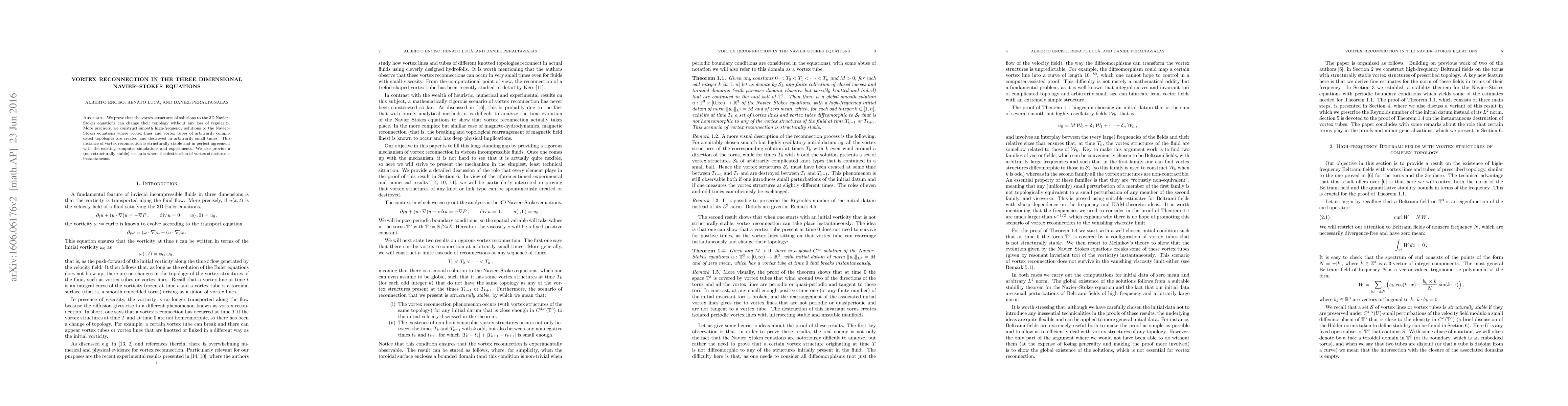 This paper demonstrates that vortex reconnection in three-dimensional Navier-Stokes equations can occur without regularity loss, constructing high-frequency smooth solutions where complex vortex topologies are dynamically created and destroyed. The reconnection process is structurally stable and aligns with empirical simulations and experiments.