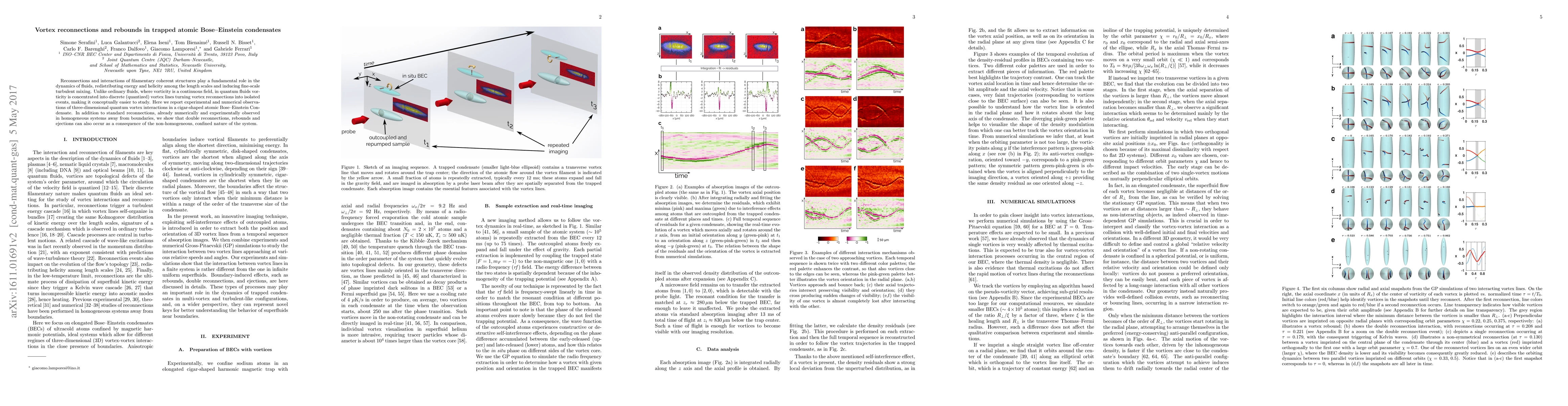 Reconnections and interactions of filamentary coherent structures play a fundamental role in the dynamics of fluids, plasmas and nematic liquid crystals. In fluids, vortex reconnections redistribute energy and helicity among the length scales and induce fine-scale turbulent mixing. Unlike ordinary fluids where vorticity is a continuous field, in quantum fluids vorticity is concentrated into discrete (quantized) vortex lines turning vortex reconnections into isolated events, making it conceptually easier to study. Here we report experimental and numerical observations of three-dimensional quantum vortex interactions in a cigar-shaped atomic Bose-Einstein Condensate (BEC). In addition to standard reconnections, already numerically and experimentally observed in homogeneous systems away from boundaries, we show that double reconnections, rebounds and ejections can also occur as a consequence of the non-homogeneous, confined nature of the system.