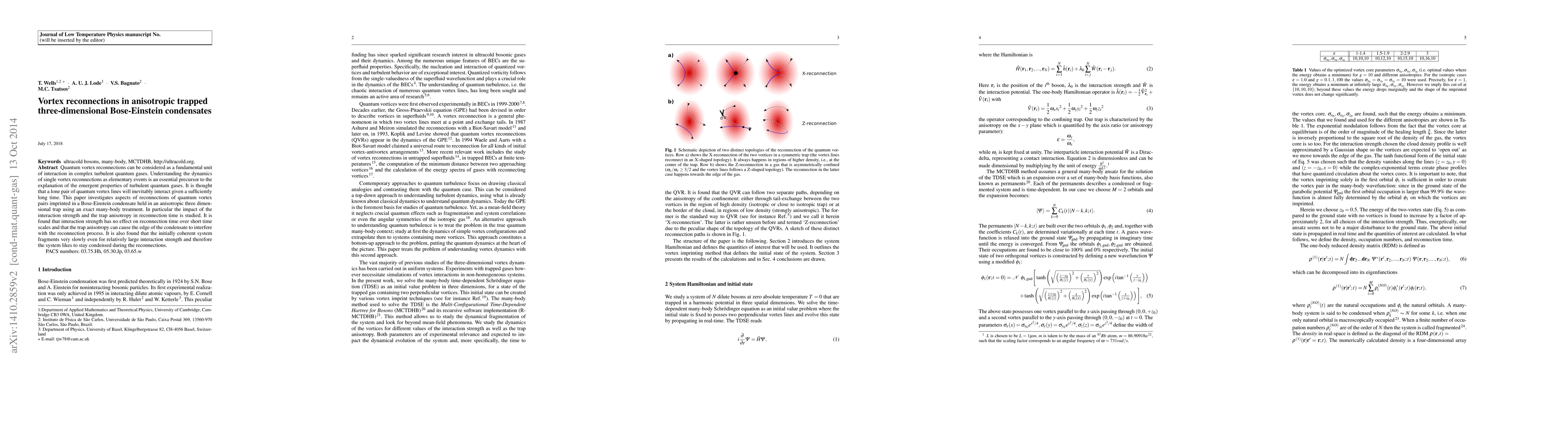 Quantum vortex reconnections can be considered as a fundamental unit of interaction in complex turbulent quantum gases. Understanding the dynamics of single vortex reconnections as elementary events is an essential precursor to the explanation of the emergent properties of turbulent quantum gases. It is thought that a lone pair of quantum vortex lines will inevitably interact given a sufficiently long time. This paper investigates aspects of reconnections of quantum vortex pairs imprinted in a Bose-Einstein condensate held in an anisotropic three dimensional trap using an exact many-body treatment. In particular the impact of the interaction strength and the trap anisotropy in the reconnection time is studied. It is found that interaction strength has no effect on reconnection time over short time scales and that the trap anisotropy can cause the edge of the condensate to interfere with the reconnection process. It is also found that the initially coherent system fragments very slowly, even for relatively large interaction strength, and therefore the system likes to stay condensed during the reconnections.